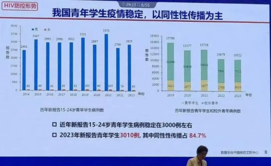 12月1日,是第37个“世界艾滋病日”,国家卫健委卫生发展研究中心等单位联合发布的《中国青年生殖健康蓝皮书》显示,2023年共报告15-24岁青年学生病例3010例, 占当年新报告病例2.7%;2023年青年学生病例的男女比34.4:1,同性性传播84.7%,异性性传播占14.0%。近年来,报告15-17岁的青年学生病例均在400例以上。