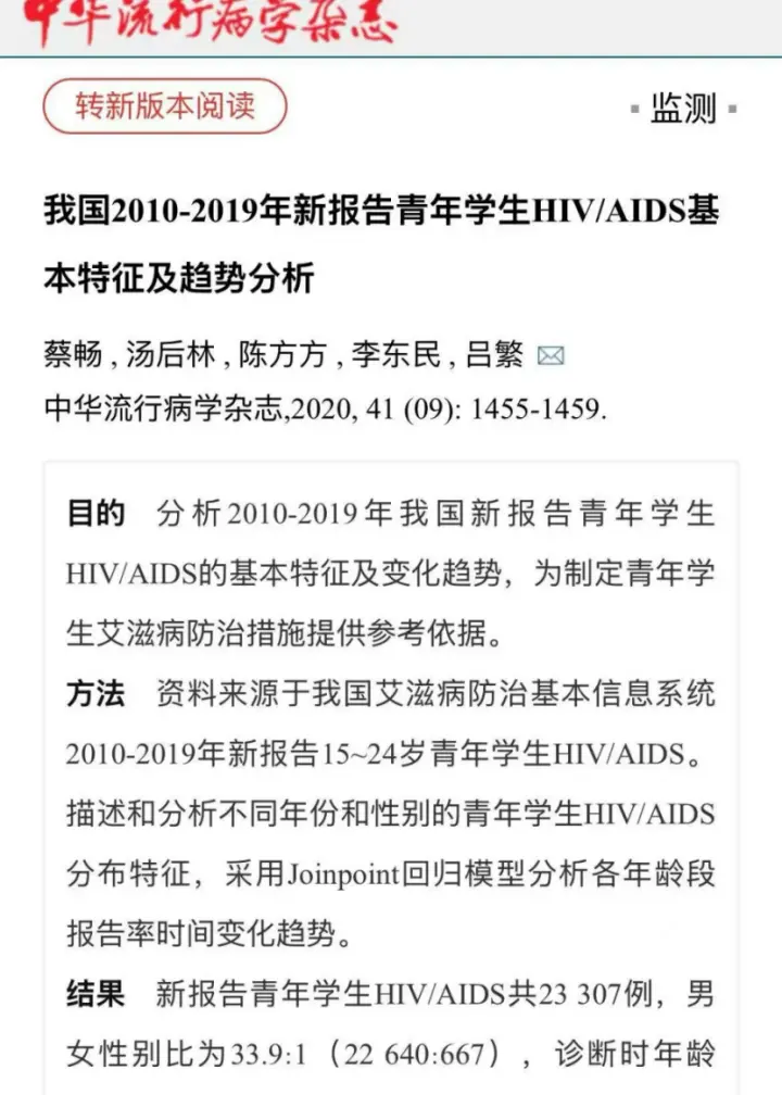 2019年5月,由中国疾控专家与清华大学医学院共同在《科学》杂志上,发表的一篇关于“HIV upsurge in China’s students(HIV在中国学生群体中飙升)”的评论文章称**:“导致艾滋病日益严重的一个因素可能是大学前性教育有限。由于中国成绩最好的年轻人中只有三分之一能上大学,大学前教育主要侧重于学术研究。最近的调查显示,大约一半的大学生接受过性教育,但这些教育通常很少(不包括艾滋病毒和性传播疾病(STD)的预防措施),而且内容保守。”**