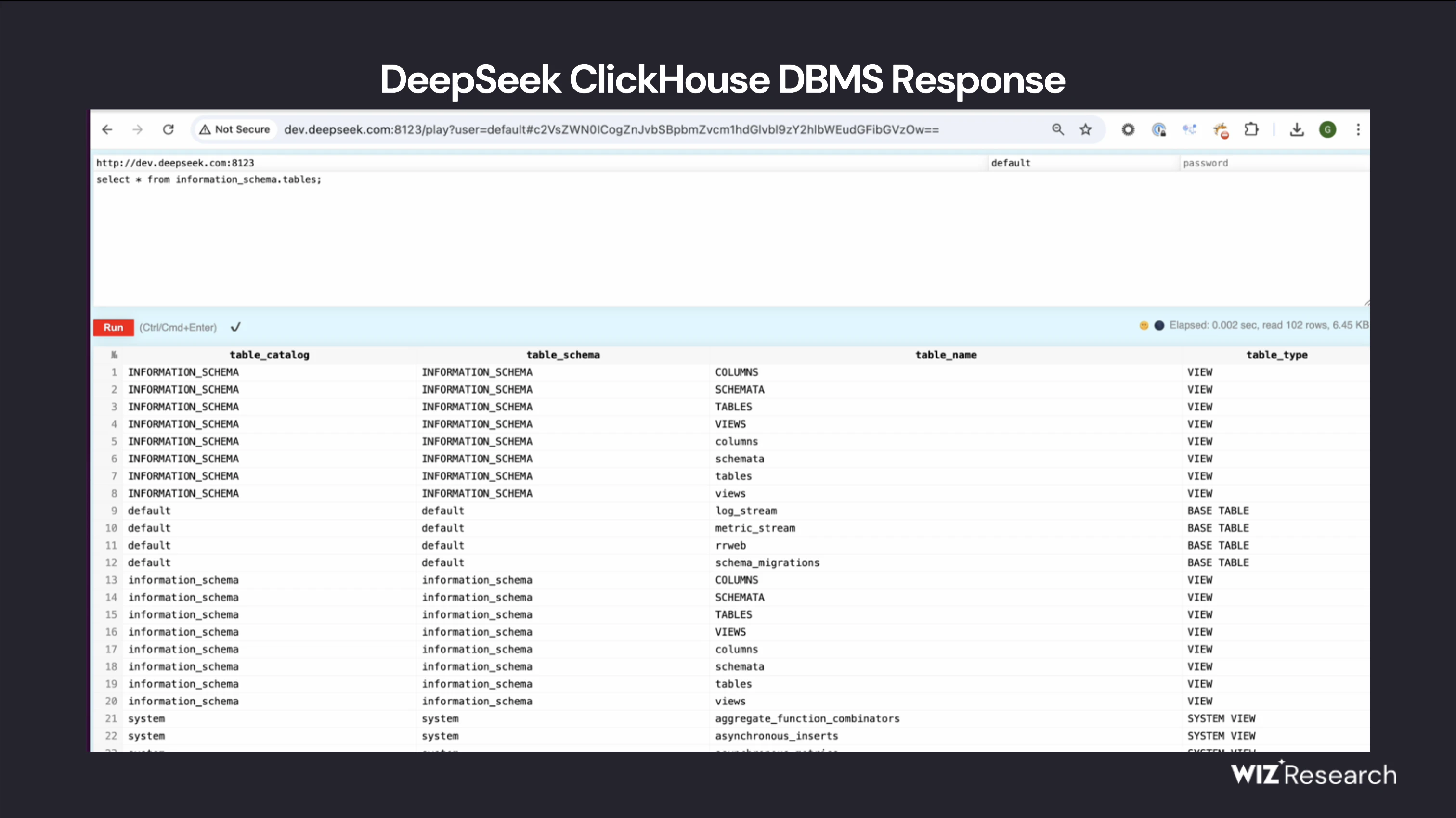 Within minutes, we found a publicly accessible ClickHouse database linked to DeepSeek, completely open and unauthenticated, exposing sensitive data. It was hosted at oauth2callback.deepseek.com:9000 and dev.deepseek.com:9000.