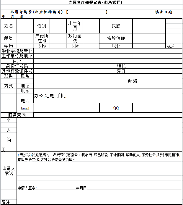 (一)申请人直接到开展志愿者注册工作的团组织、志愿者组织提出申请或通过网络、通讯等方式提出申请,填写《志愿者注册登记表》(参考式样见下图)。