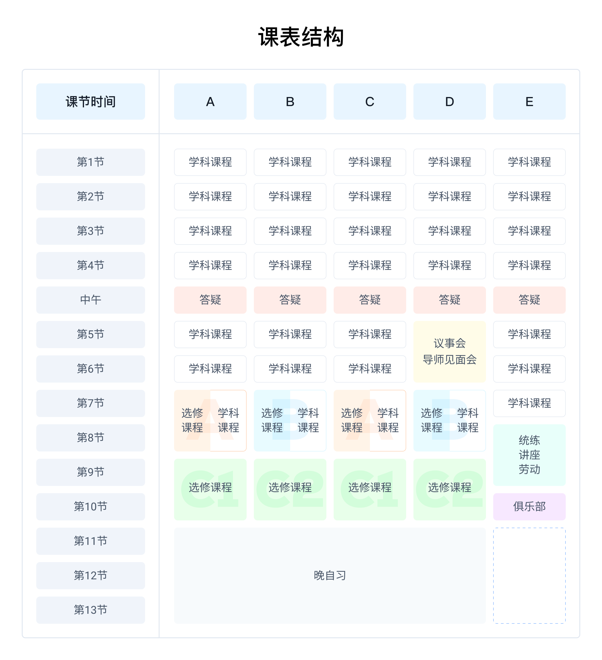 每周有五天,常规情况下从星期一到星期五分别用A、B、C、D、E表示,遇到节假日放假等情况时,字母所对应的星期会有所调整,具体以学校每年发布的校历为准。课表每天分10个时段即10节课,每节课40分钟,上午4节,下午6节,分为三种课位,必修课位、选修课位、活动课位。