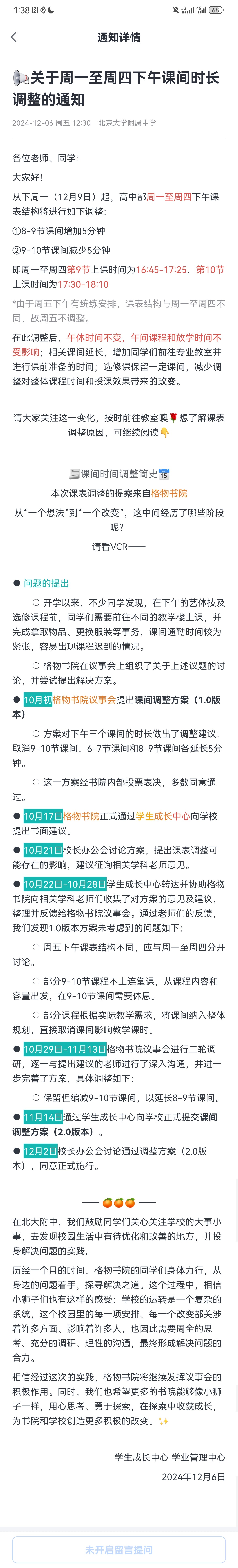 从12月9日(下周一)起,高中部周一至周四下午课表结构将进行如下调整: