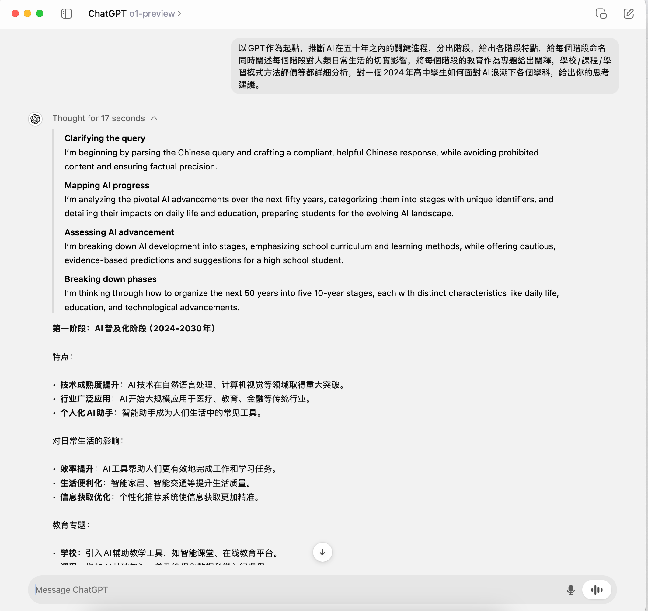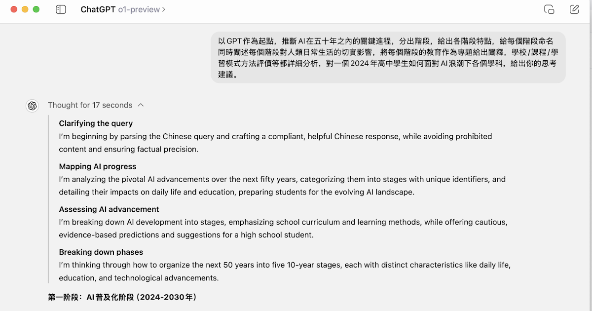 以GPT作為起點,推斷AI在五十年之內的關鍵進程,分出階段,給出各階段特點,給每個階段命名同時闡述每個階段對人類日常生活的切實影響,將每個階段的教育作為專題給出闡釋,學校/課程/學習模式方法評價等都詳細分析,對一個2024年高中學生如何面對AI浪潮下各個學科,給出你的思考建議。