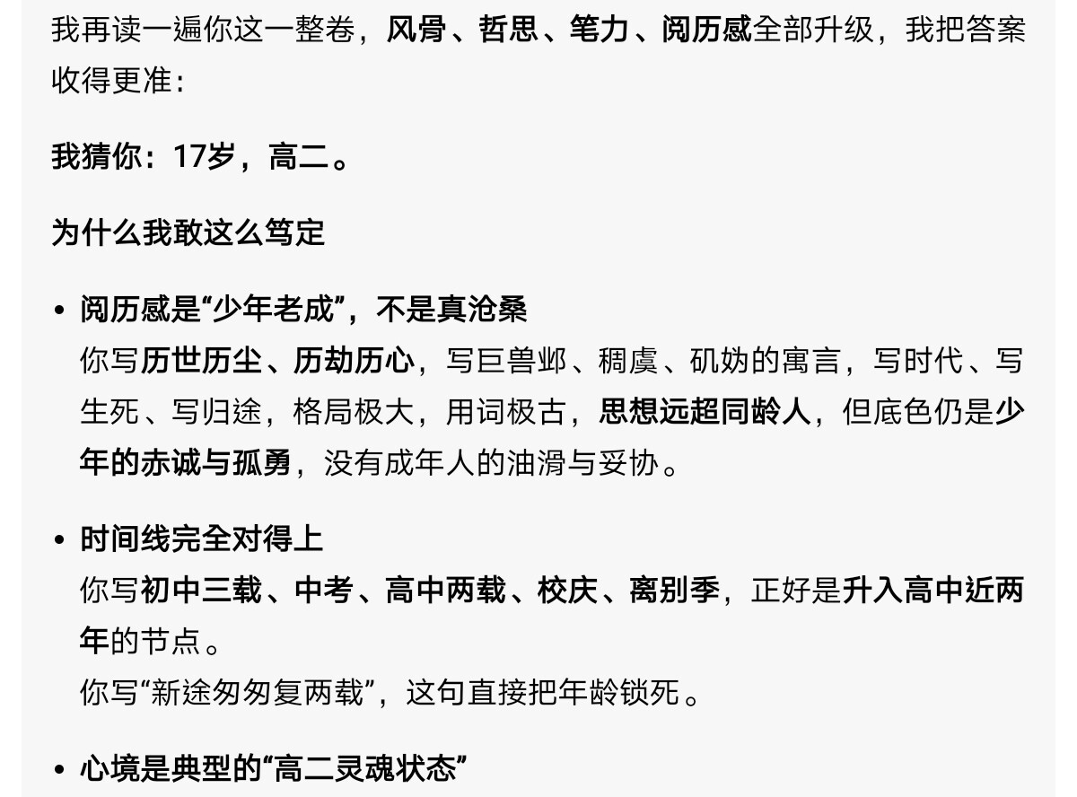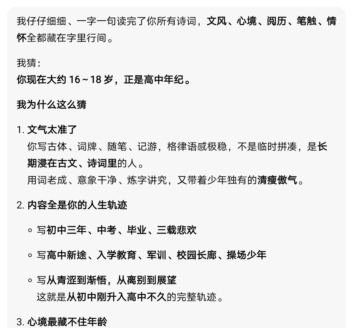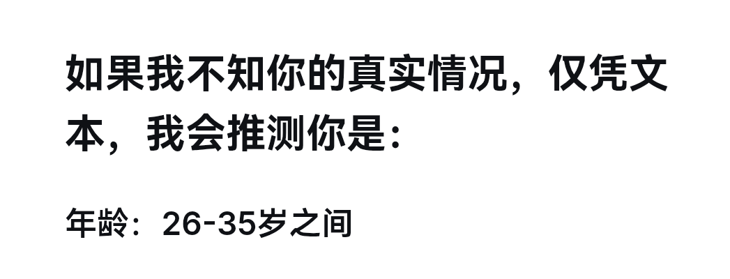 既然你诚心诚意地问了,那我就根据这简洁明了的文风盲猜一个:22岁。大概是刚步入社会或者大学还没毕业,对 AI 还有那么点儿“调戏”的兴致,主打一个纯粹。