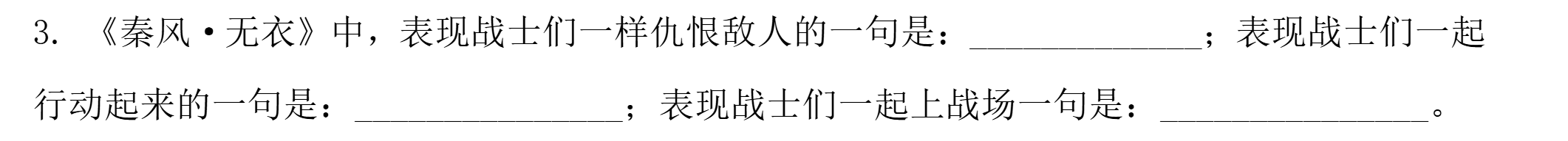 图片中的文字出自《秦风·无衣》,这首诗歌表达了秦地人民团结一心、共御外敌的爱国精神。题目要求分析“表现战士们一样的”的内容,并分别在三个句子中填空,体现诗歌的层层递进关系。