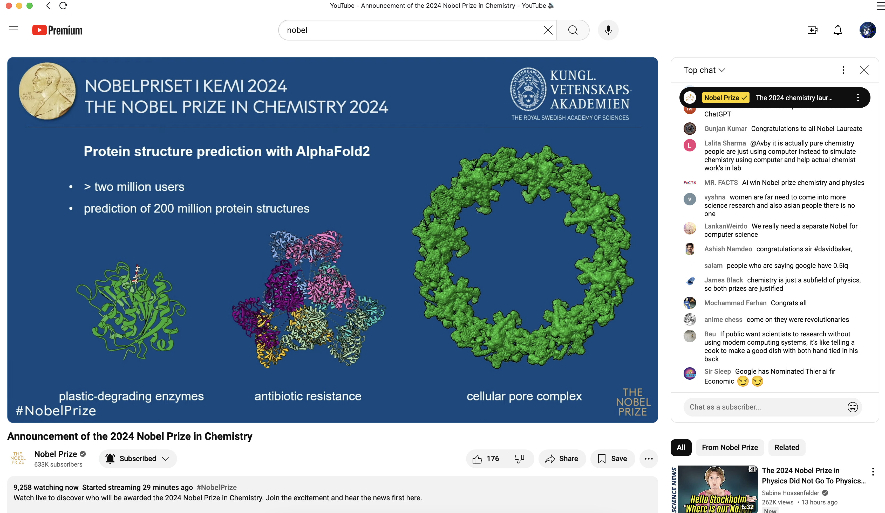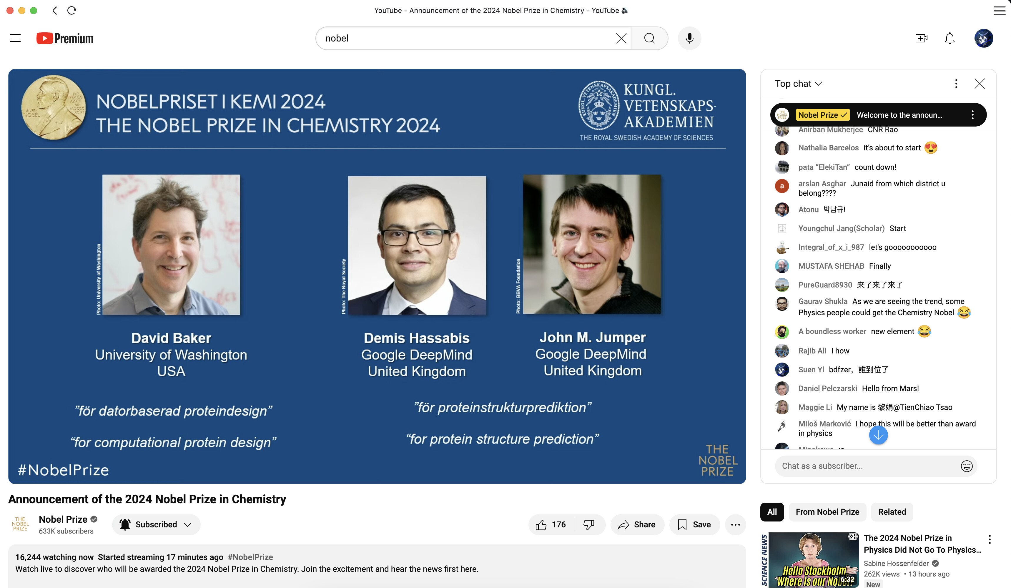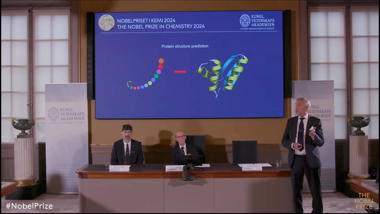 BREAKING NEWS The Royal Swedish Academy of Sciences has decided to award the 2024 #NobelPrize in Chemistry with one half to David Baker “for computational protein design” and the other half jointly to Demis Hassabis and John M. Jumper “for protein structure prediction.”