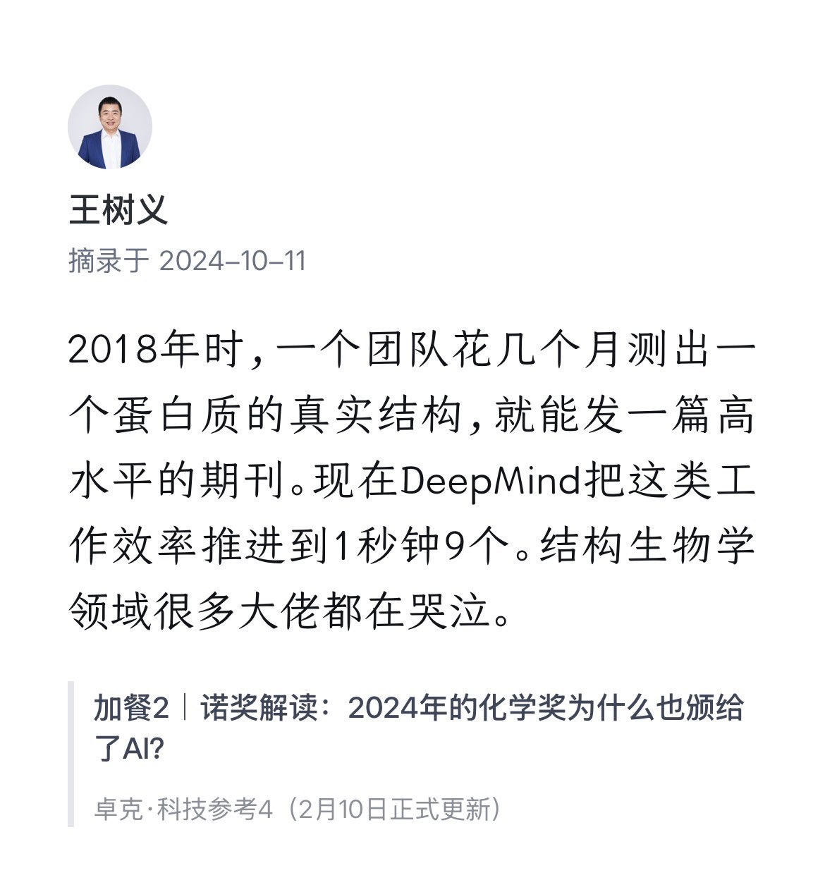 您说得很有洞察力。这两场颁奖(诺贝尔生理学或医学奖和化学奖)的确可以被视作学术之路被颠覆的先声,预示着“无AI不学术”时代的到来。