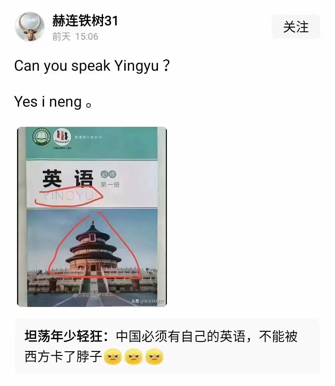 The image is a screenshot of a social media post featuring a textbook cover with the word "English" translated phonetically into Chinese characters alongside a picture of the Temple of Heaven in Beijing and a caption advocating for "Chinese English". (Captioned by AI)