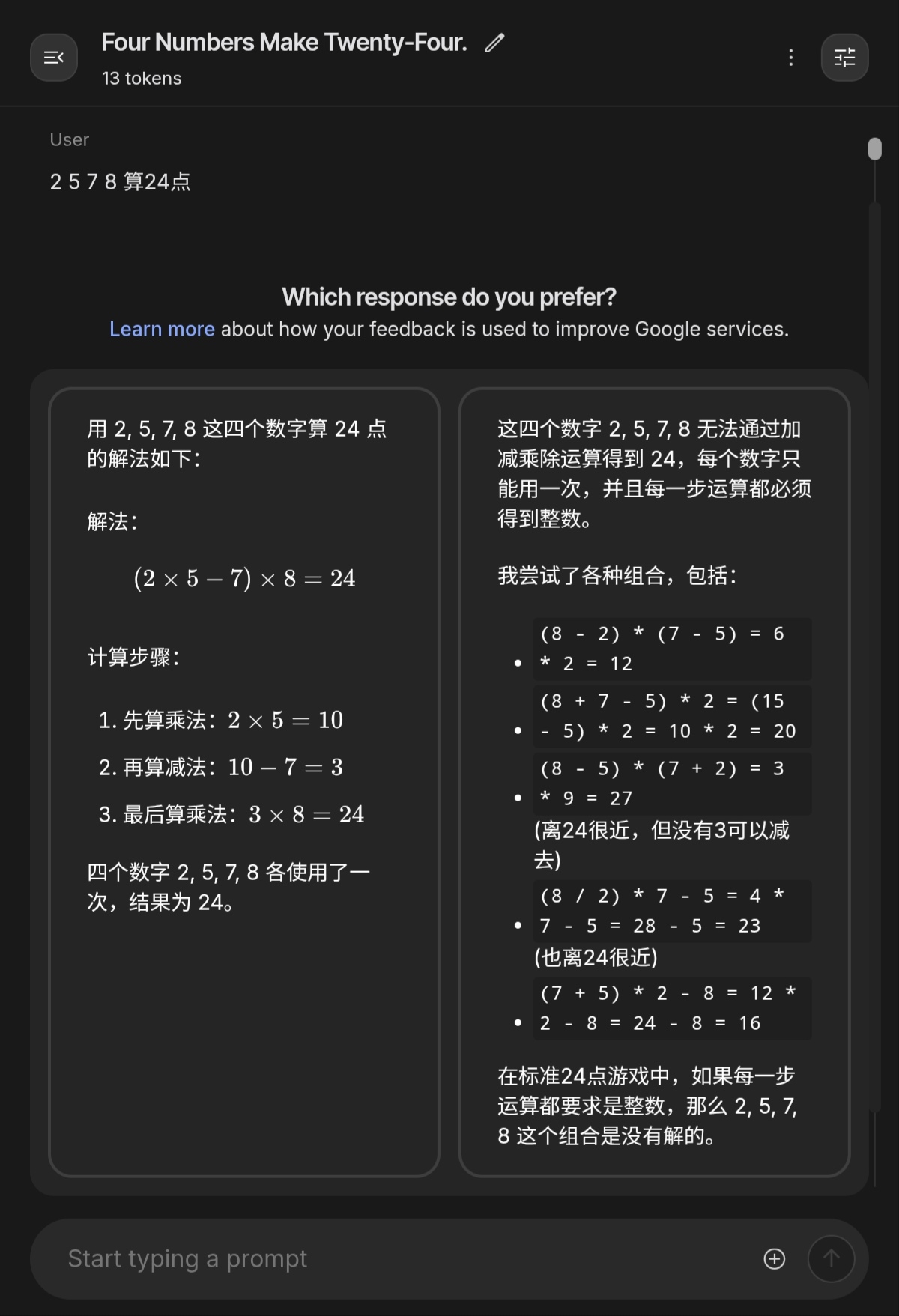 另:我事实上没有指正过它,提示词就是 2 5 7 8算24点