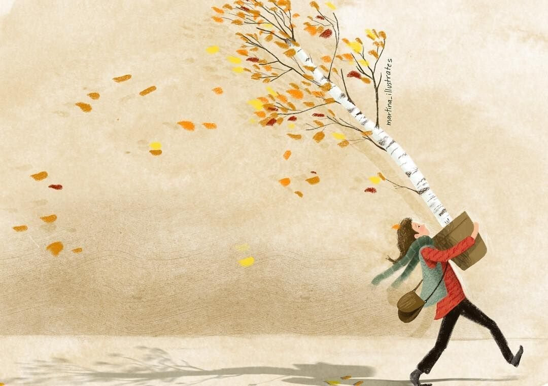 A person walks against a strong wind, carrying a birch tree with yellow and orange leaves on its branches. (Captioned by AI)