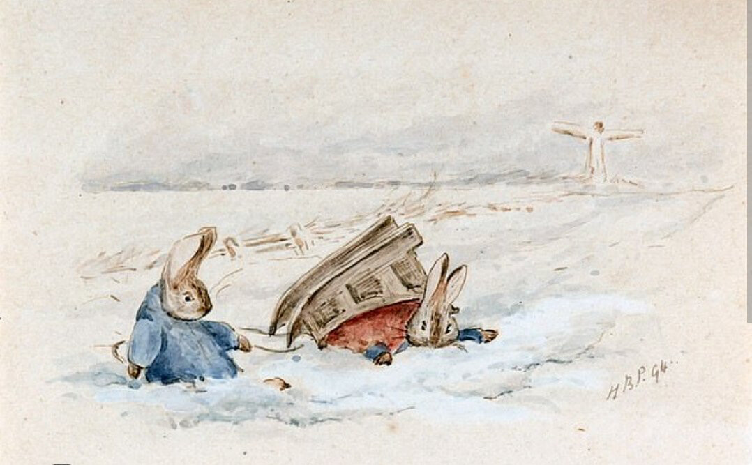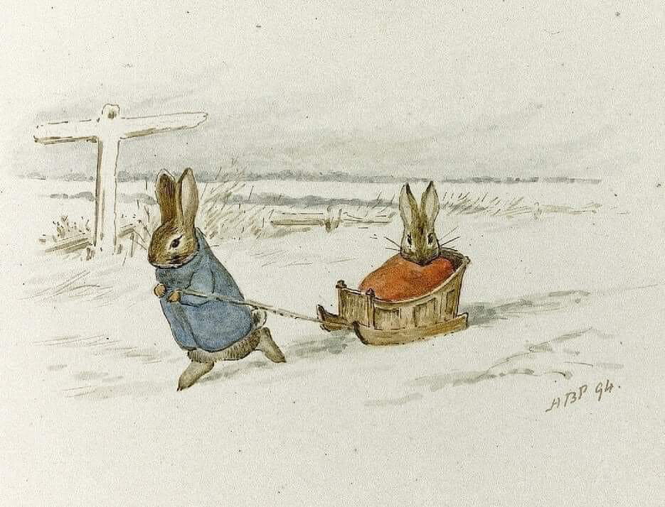 The illustration shows a rabbit wearing a blue coat pulling another rabbit riding in a small sled through a snowy field. (Captioned by AI)