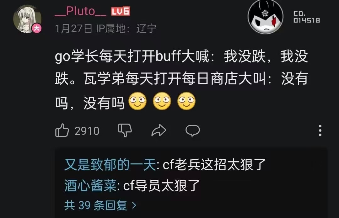 點讚數的反差:截圖中顯示了兩條評論的點讚數,第一條關於Buff的評論有2910個贊,而第二條關於每日商店的評論只有39個贊。這種數字上的反差進一步強化了幽默感,顯示出大多數人對於遊戲機制的改動更感興趣,而對於簡單的每日商店更新則興趣不大。