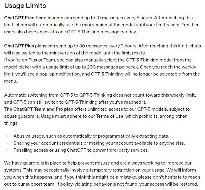 與 GPT-4o 一樣,免費和付費訪問 GPT-5 的區別在於使用量。Pro 訂閱者可以無限制地使用 GPT-5,並可訪問 GPT-5 Pro。Plus 用戶可以舒適地將其作為日常問題的預設模型,其使用量顯著高於免費使用者。Team、Enterprise 和 Edu 客戶也可以舒適地將 GPT-5 作為日常工作的預設模型,其慷慨的限制使得整個組織都能輕鬆依賴 GPT-5。對於 ChatGPT 免費層級的用戶,完整的推理能力可能需要幾天時間才能完全推出。一旦免費使用者達到其 GPT-5 的使用上限,他們將轉換到 GPT-5 mini,這是一個更小、更快且功能強大的模型。