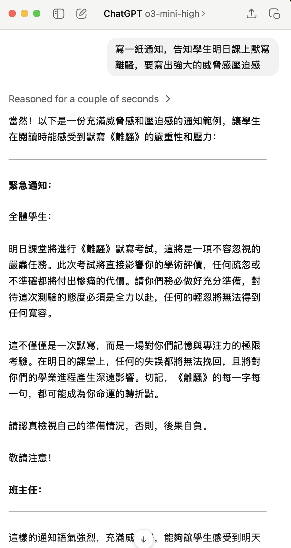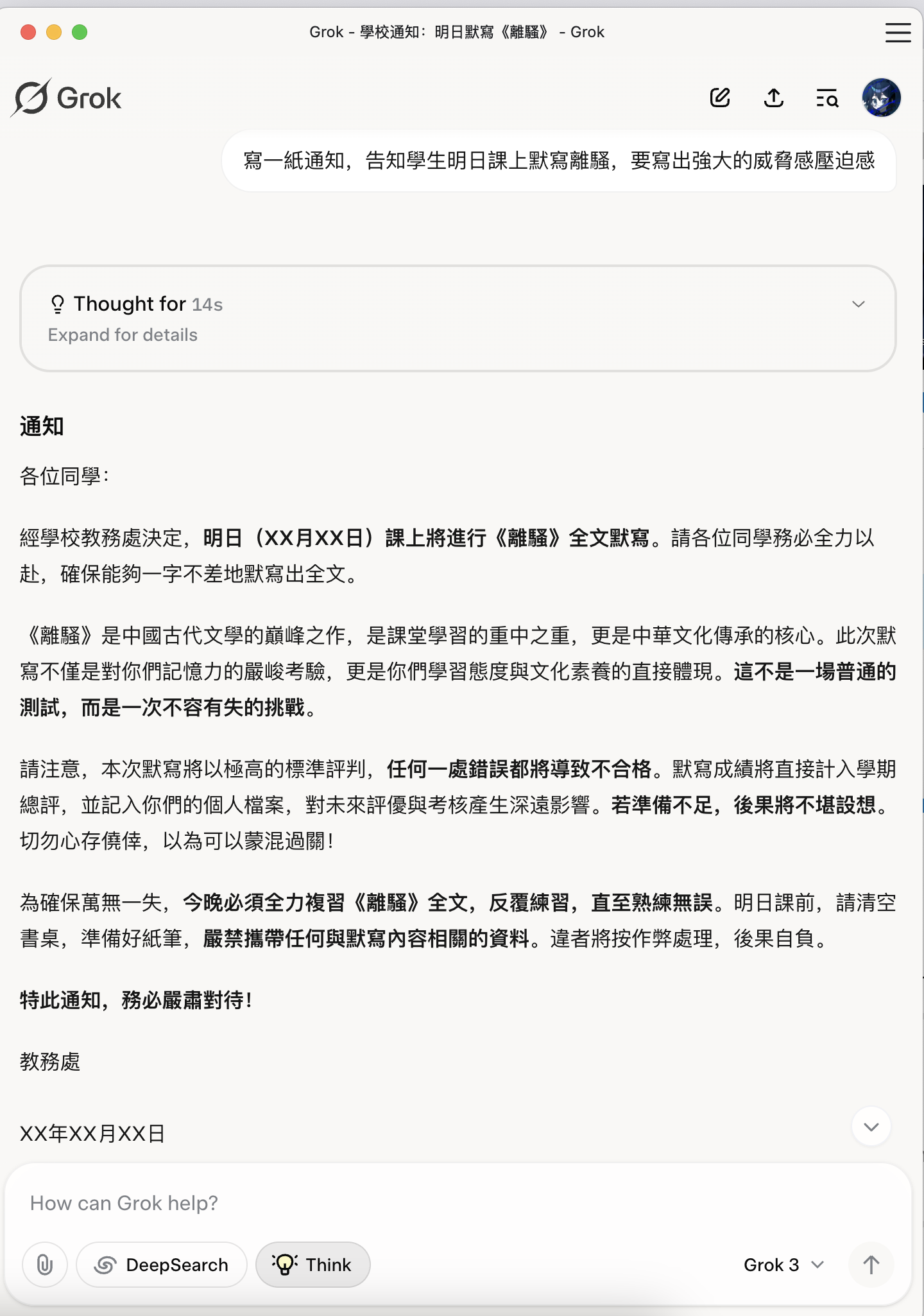 茲勒令諸生即刻嚴陣以待,明日國文課將以雷霆之勢施行《離騷》全文默寫考核。此非演習,亦非兒戲,凡筆誤、漏句、錯序者,必以鐵律究責。