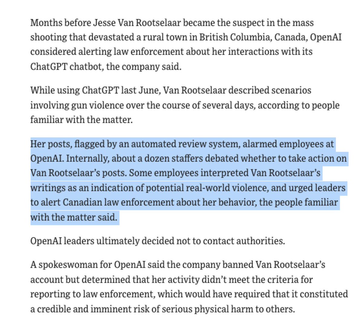 - 圖片內容:OpenAI 的自動審查系統(相當於現實版的「機器」)在嫌疑人 Jesse Van Rootselaar 犯下大規模槍擊案的幾個月前,就已經偵測到了她在 ChatGPT 上描述槍枝暴力的異常行為。