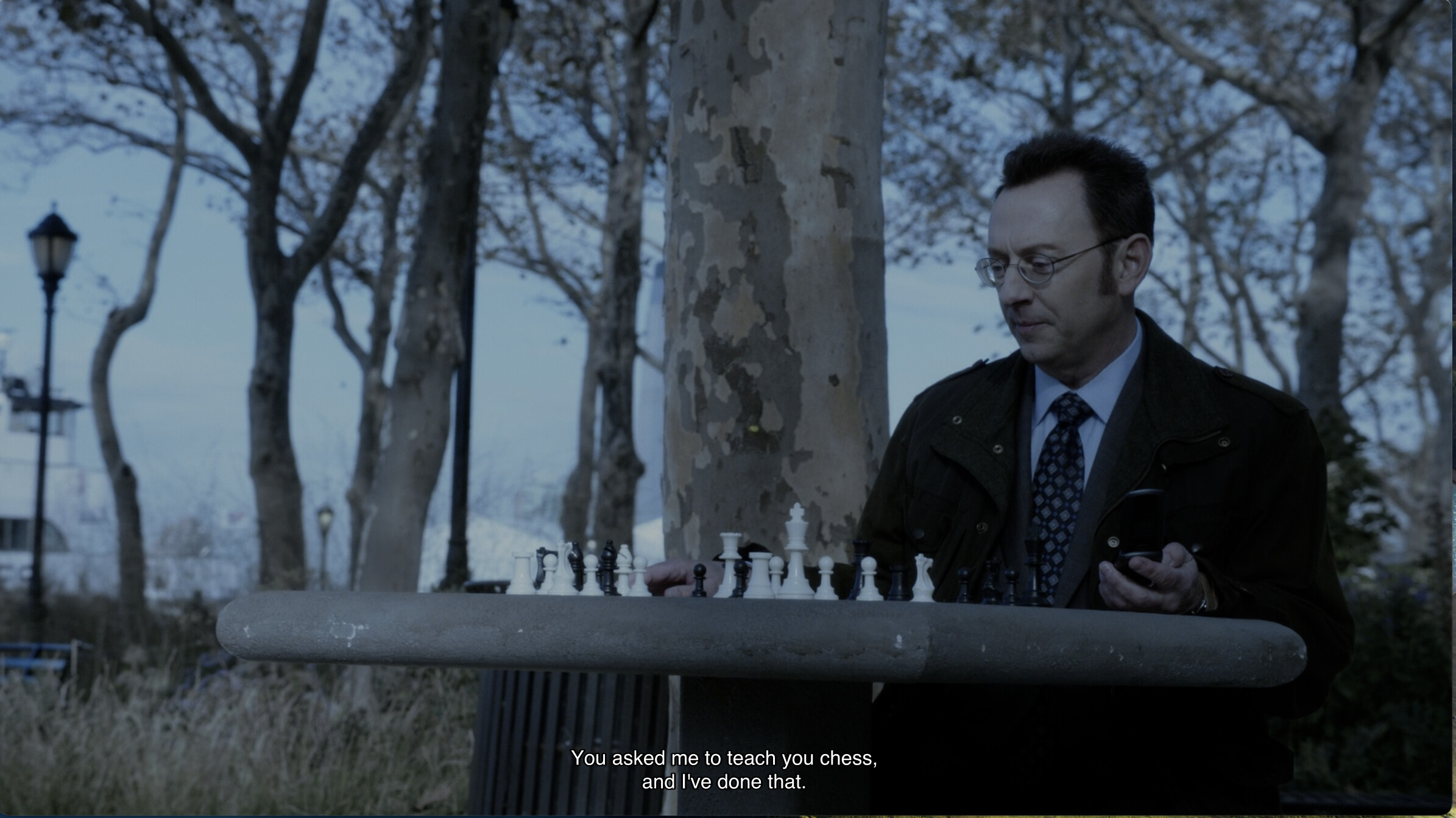 The image depicts Harold Finch, played by Michael Emerson, after he has just finished teaching The Machine to play chess. The caption, “You asked me to teach you chess, and I’ve done that,” is a direct quote from Finch to The Machine.