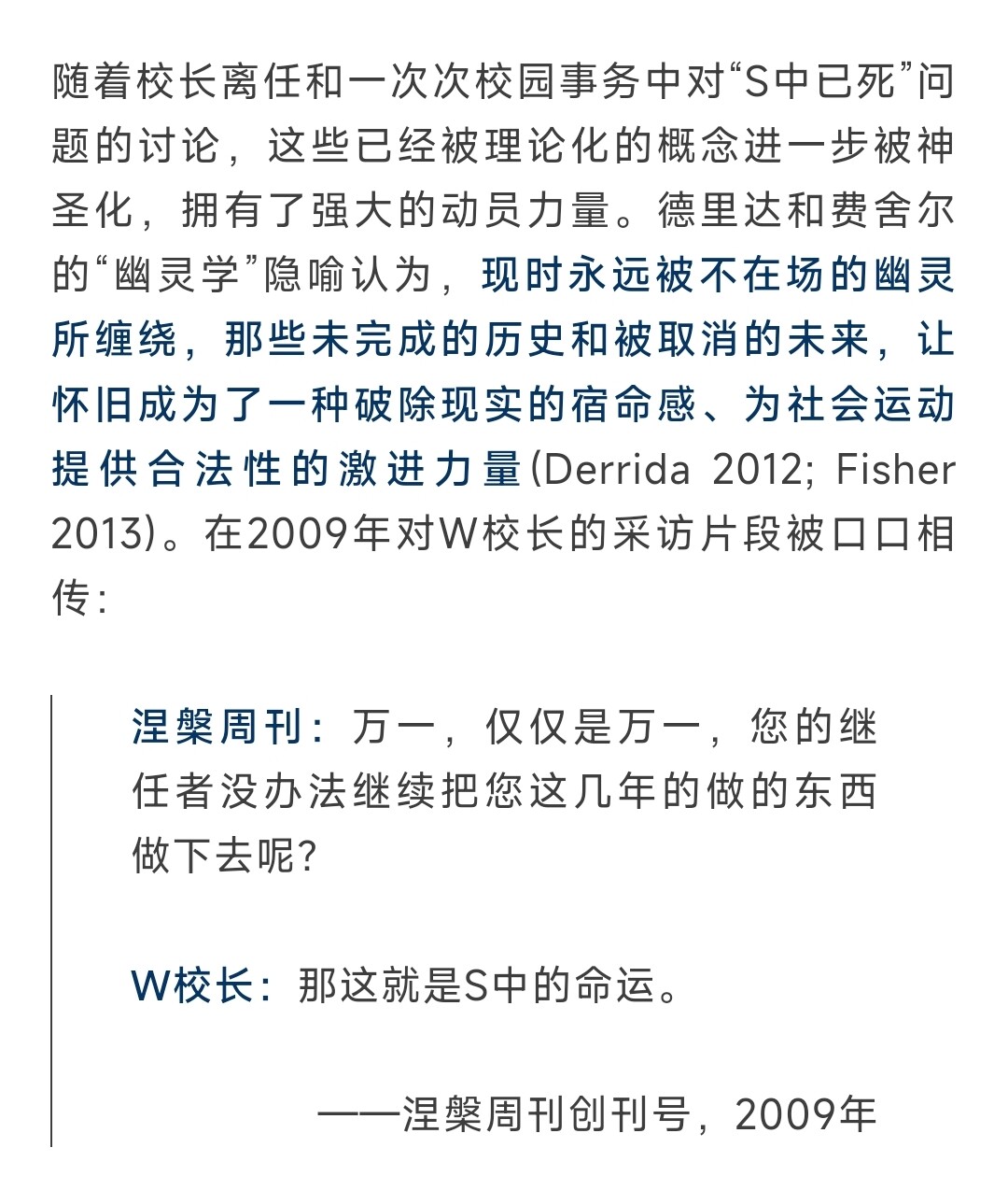 随着校长离任和一次次校园事务中对“S中已死”问题的讨论,这些已经被理论化的概念进一步被神圣化,拥有了强大的动员力量。德里达和费舍尔的“幽灵学”隐喻认为,现时永远被不在场的幽灵所缠绕,那些未完成的历史和被取消的未来,让怀旧成为了一种破除现实的宿命感、为社会运动提供合法性的激进力量 (Derrida 2012; Fisher 2013)。在2009年对W校长的采访片段被口口相传: