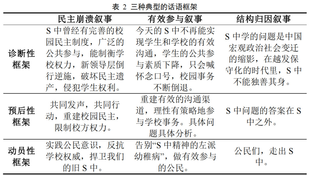 上文所述的案例,主要来自于第一种框架:“民主崩溃”叙事。这是最主流、最有普适性和最具煽动性的框架。这种框架指导的集体行动往往娴熟地运用**“框架放大”** 策略,将所有管理冲突公式化地上升为对S中精神的生死考验,通过对历史的回顾和对比引发框架共鸣,对旁观者动员一种基于身份认同的焦虑。自W校长时代至今,不断有学生对这一框架进行反思:神圣化的大型话语固然有强大的情感动员功能,但在解决问题方面往往只会起到负作用。一些学生指出,应当将浪漫化的S中情怀转化为一种具体的政治技术,发展出了笔者概括为“有效参与叙事”的第二种框架: