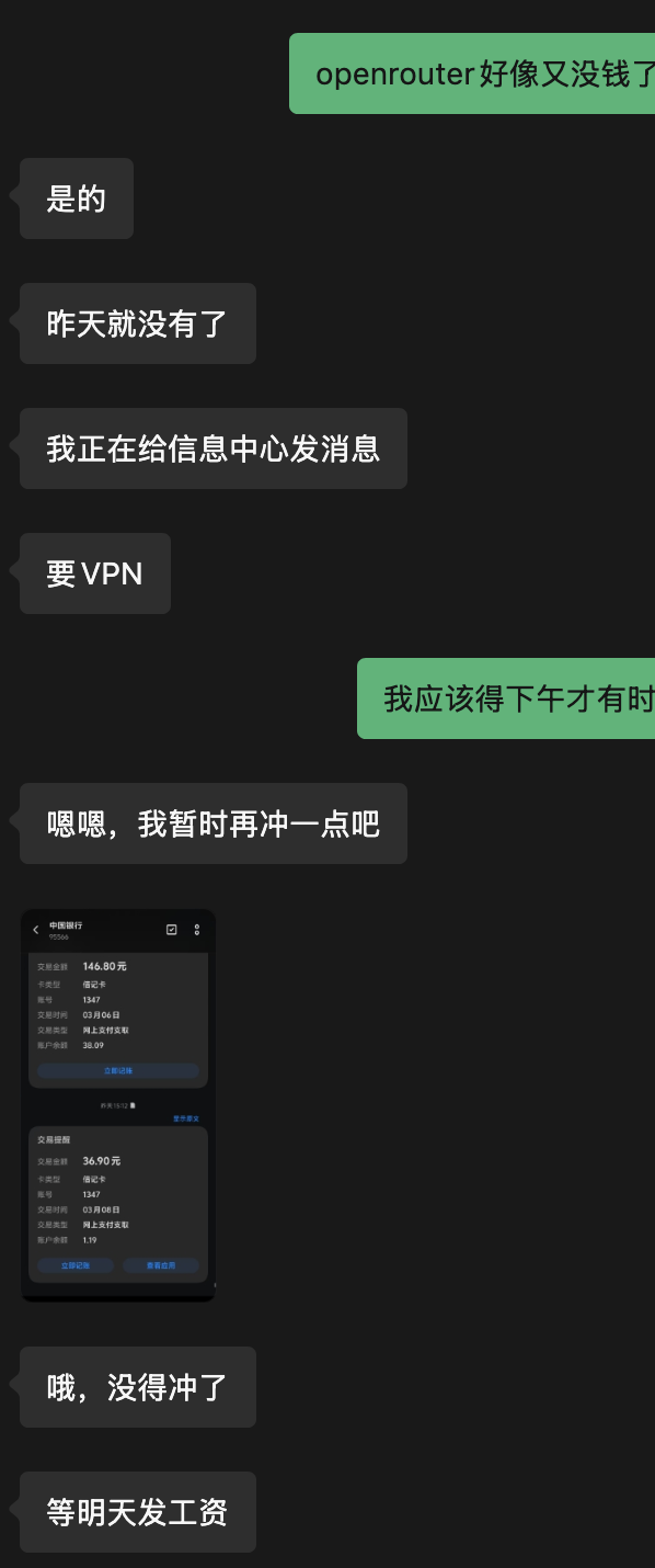 不过说真的,这种靠爱发电的校内工具,挂了确实只能等。你要是真急用,还是听 TP 的,去弄个 Cherry Studio 挂中转 API 吧,那玩意儿稳多了。