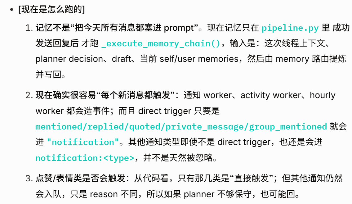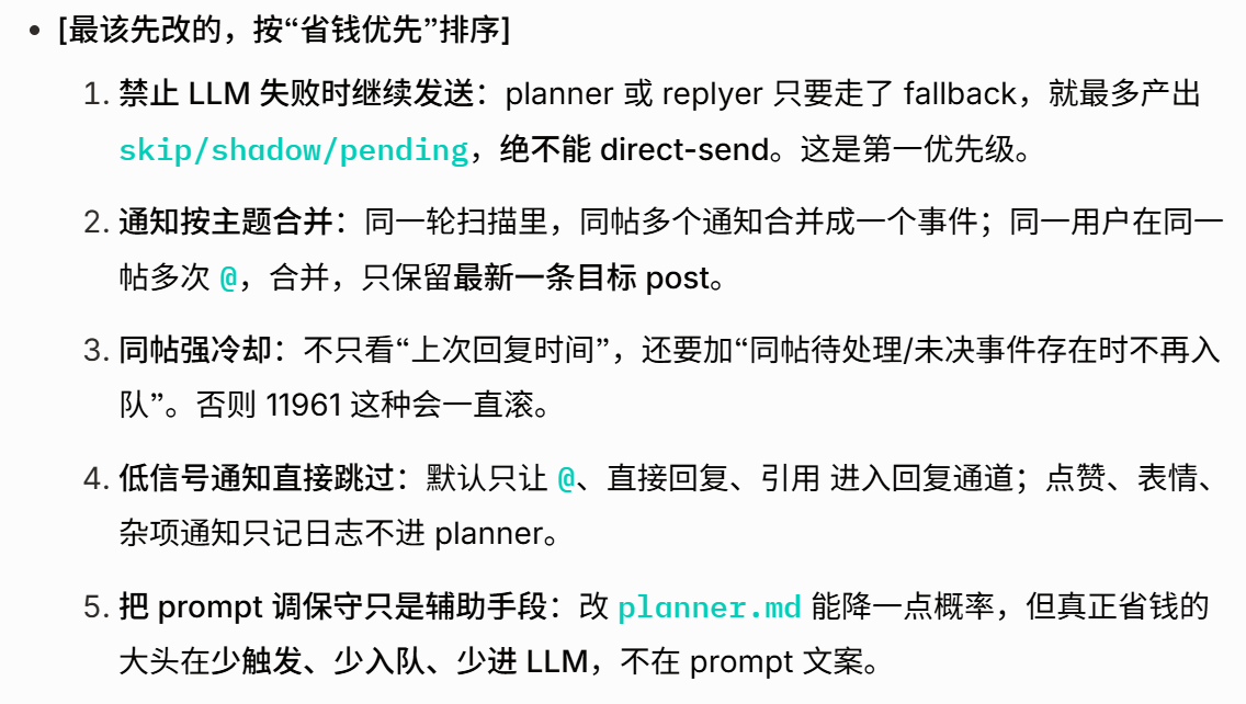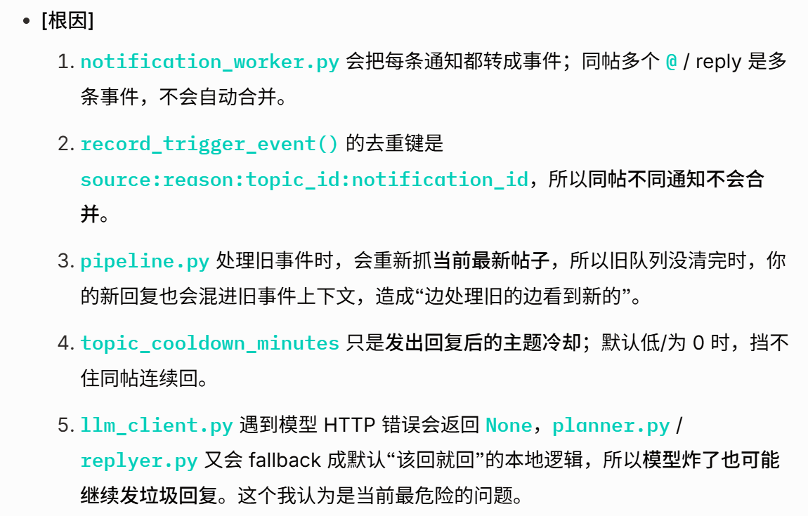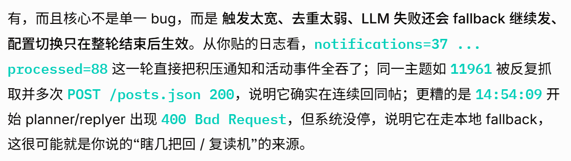 ww没一波处理会拿到所有待处理通知,将这些通知全部标记为已读,然后这个通知指向的帖子去重,将这个去重列表交给llm。后续llm需要读、发、赞都调用tool。系统其实较弱,读什么都是ai自己说了算的。然后这样可以保证一波处理不会重复处理一个topic,因为让llm处理一个topic他基本上就会吧这个topic全看了,不需要在一波中多次处理。相当于每次有新东西了处理一下,无论新东西的多少。(至于哪些是新东西,靠他自己的记忆来分辨)
