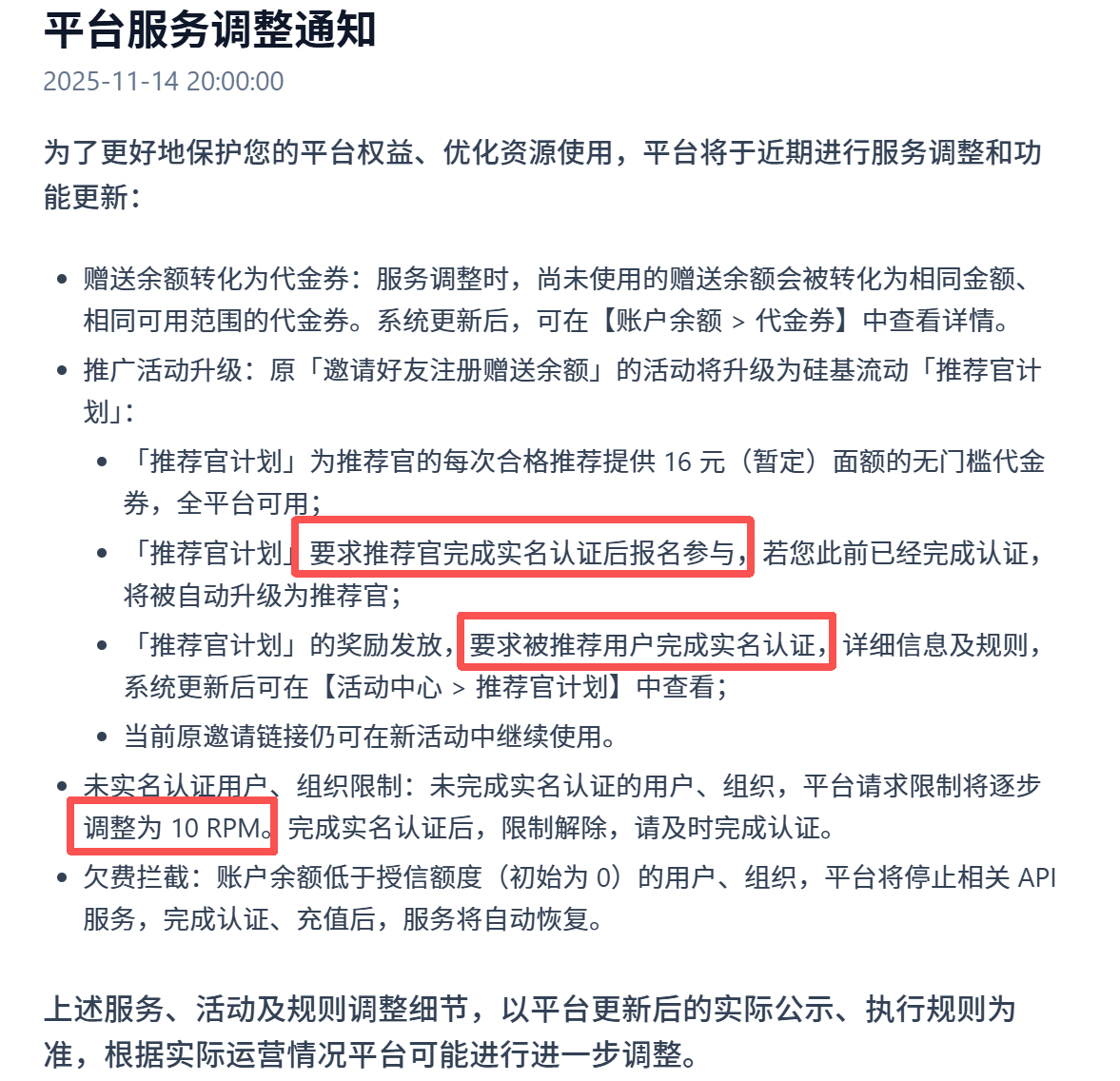 将要求被邀请的人也要实名,未实名每分钟只能6次请求。看起来硅基流准备干掉白嫖的。之前刷邀请的没法用了