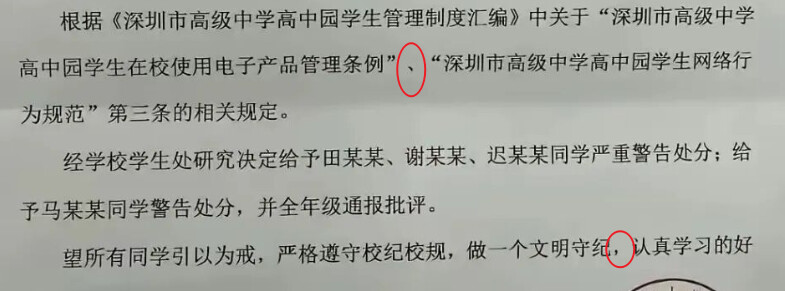“处分通告”如无必要就不写称呼,直接陈述事件即可,但这则通告,第一行顶格写“田某某、谢某某……是高一某班学生”,然后就回车,另起一行写“于2025年11月14日如何如何”,第一行既不是称呼,也不是一句完整的话。让人莫名其妙。