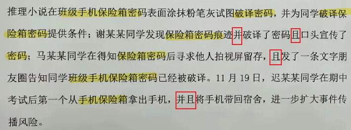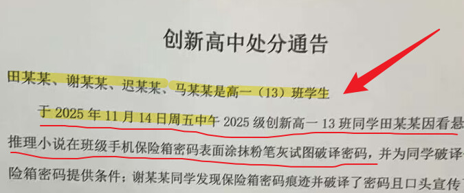 请再读一遍这句话:“于2025年11月14日周五中午2025级创新高一13班同学田某某因看悬疑推理小说在班级手机保险箱密码表面涂抹粉笔试图破译密码。”
