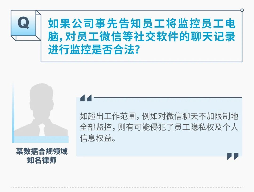 上述知名律师称,国家法律明确规定了侵犯公民个人信息的法律后果。微信聊天记录等通信内容虽然不能直接等同于公民个人信息,但二者存在交叉。最高人民法院、最高人民检察院《关于办理侵犯公民个人信息刑事案件适用法律若干问题的解释》(法释〔2017〕10号)明确规定,公民个人信息是指以电子或者其他方式记录的能够单独或者与其他信息结合识别特定自然人身份或者反映特定自然人活动情况的各种信息,包括姓名,身份证件号码,通信通讯联系方式、住址、账号密码、财产状况,行踪轨迹等。微信聊天记录极有可能包含以上内容和信息,监控相关聊天内容的企业可能要承担相应的责任。