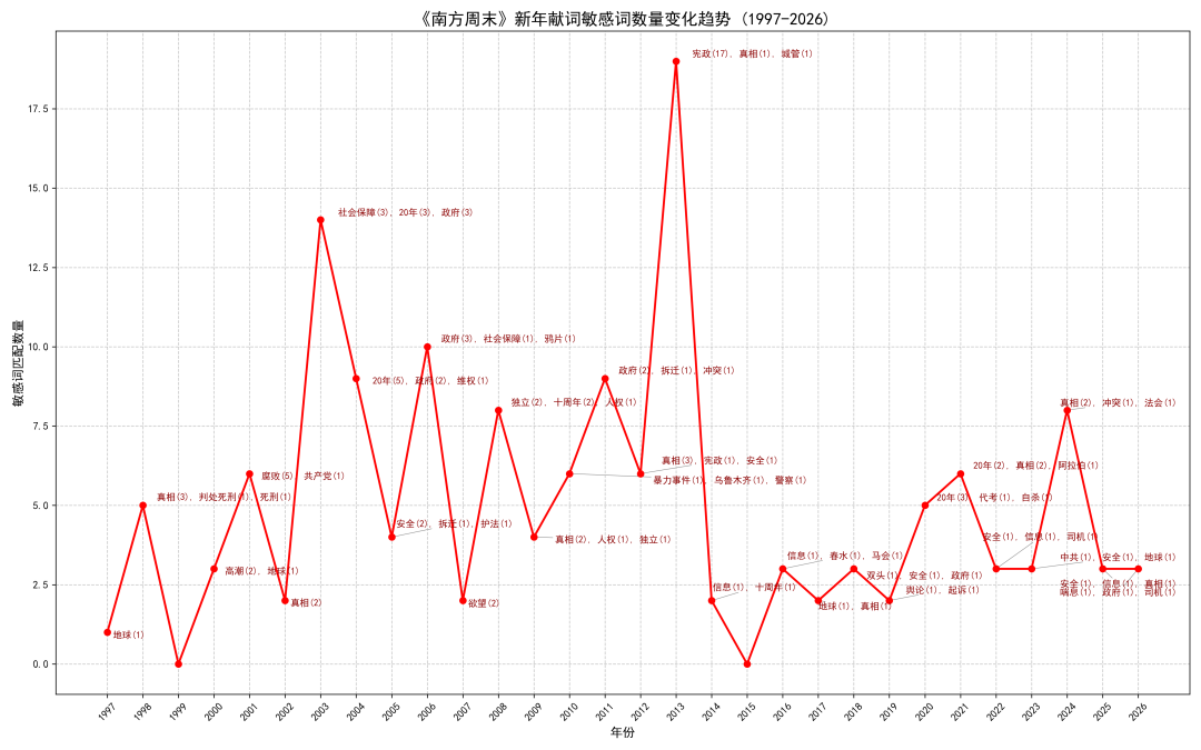 所以,从三点半考完试回到电脑前到现在,指挥Gemini Cli拿南方周末的新年献词文本(1997-2026)做了一个微不足道的定量研究,画了几张图,到现在整理成文,恰好过去了四个小时。期末考试,成文匆忙,如果读者对本文的任何部分有不同意见,那都是你对。另外,下文的所有内容都是描述性的,这意味着,笔者并不打算对南方周末新年献词文本中出现的任何变化,做任何因果上的解释,读者试图进行的任何解释,都与本文无关。以下是正文内容。