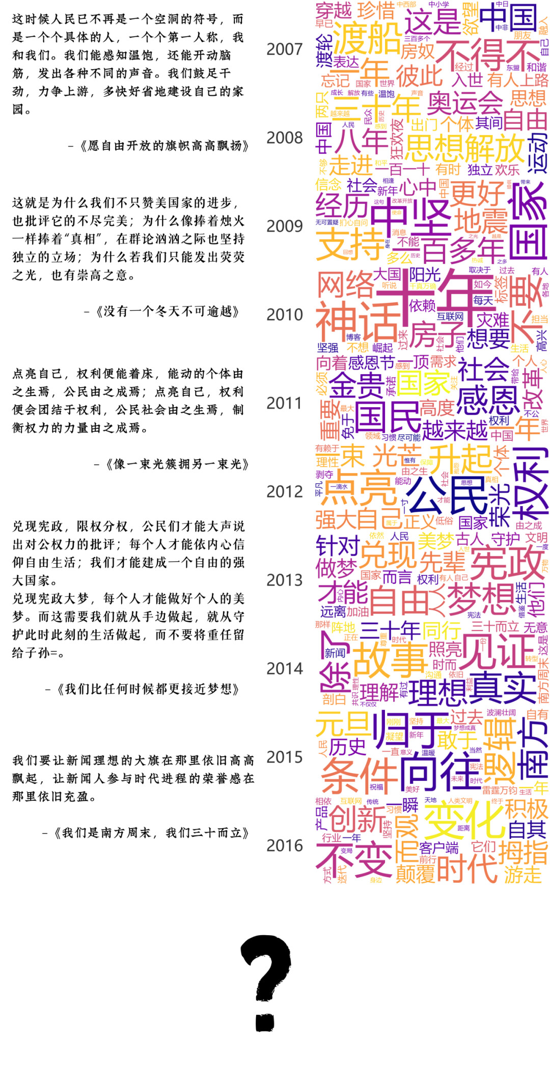 时间来到2007-2016年。这十年可以说是中国经济发展最快的十年。在词云图的前半部分,我们看见,南周从前期的新闻理想主义,转向更具政治色彩的政治修辞,如公民、xz、自由、思想解放。在2013年的顶峰之后,政治修辞逐渐消失。