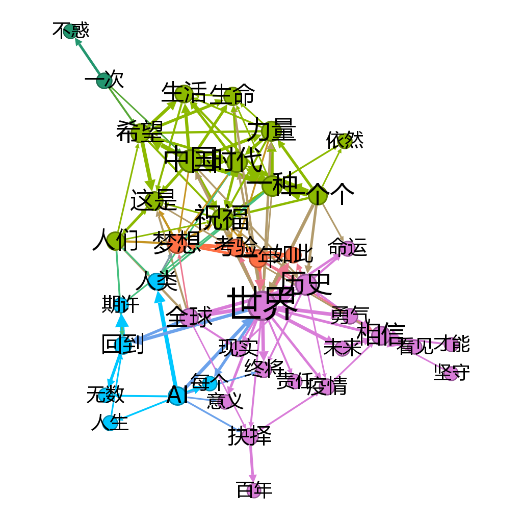 最后,我们在三个时间段的文本中,分别计算关键词之间的共现频率。以词为节点,共现频率为边权构建词共现网络,并在Gephi中用ForceAtlas2算法进行可视化,处于相近语境的词会被布局算法拉到一起,并且由Louvain社区检测算法进行聚类染色。以下是可视化结果。