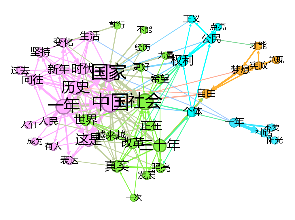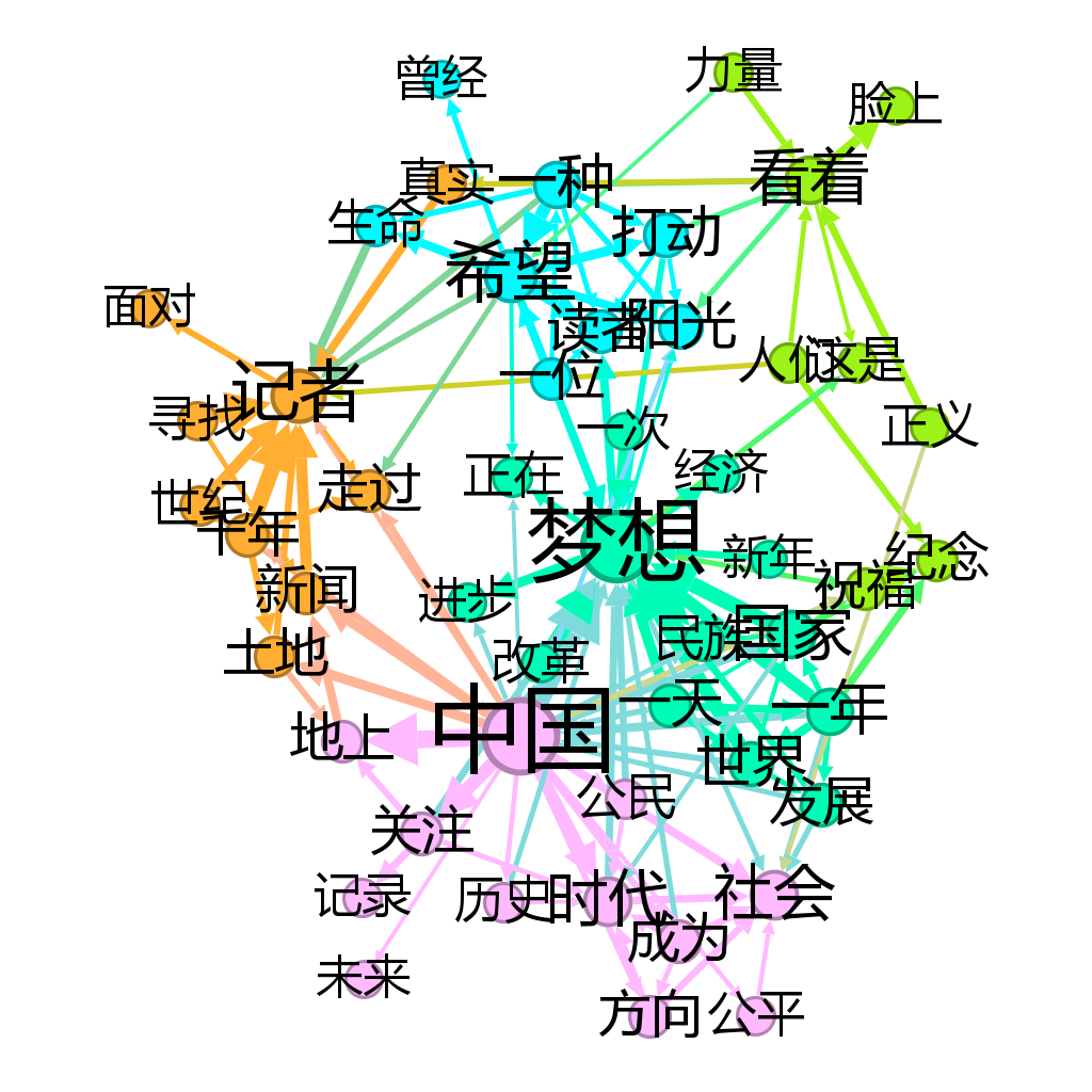 这一时期的词云图,核心主题在于新闻理想、社会关切和国家祝愿,分别对应下图的词共现网络中橙色、粉色和青绿色的聚类簇。新闻理想聚类和社会关切聚类有高度关联,社会关切聚类和国家祝愿聚类关联,但新闻理想和国家祝愿的聚类之间没有直接的边的联系。这意味着,在这时的叙事中,新闻理想、社会变革和国家民族的命运形成一个清晰的线性因果链条:因为有记者的寻找和关注,所以社会能进步,正义能实现。这是典型的现代性进步时间观。
