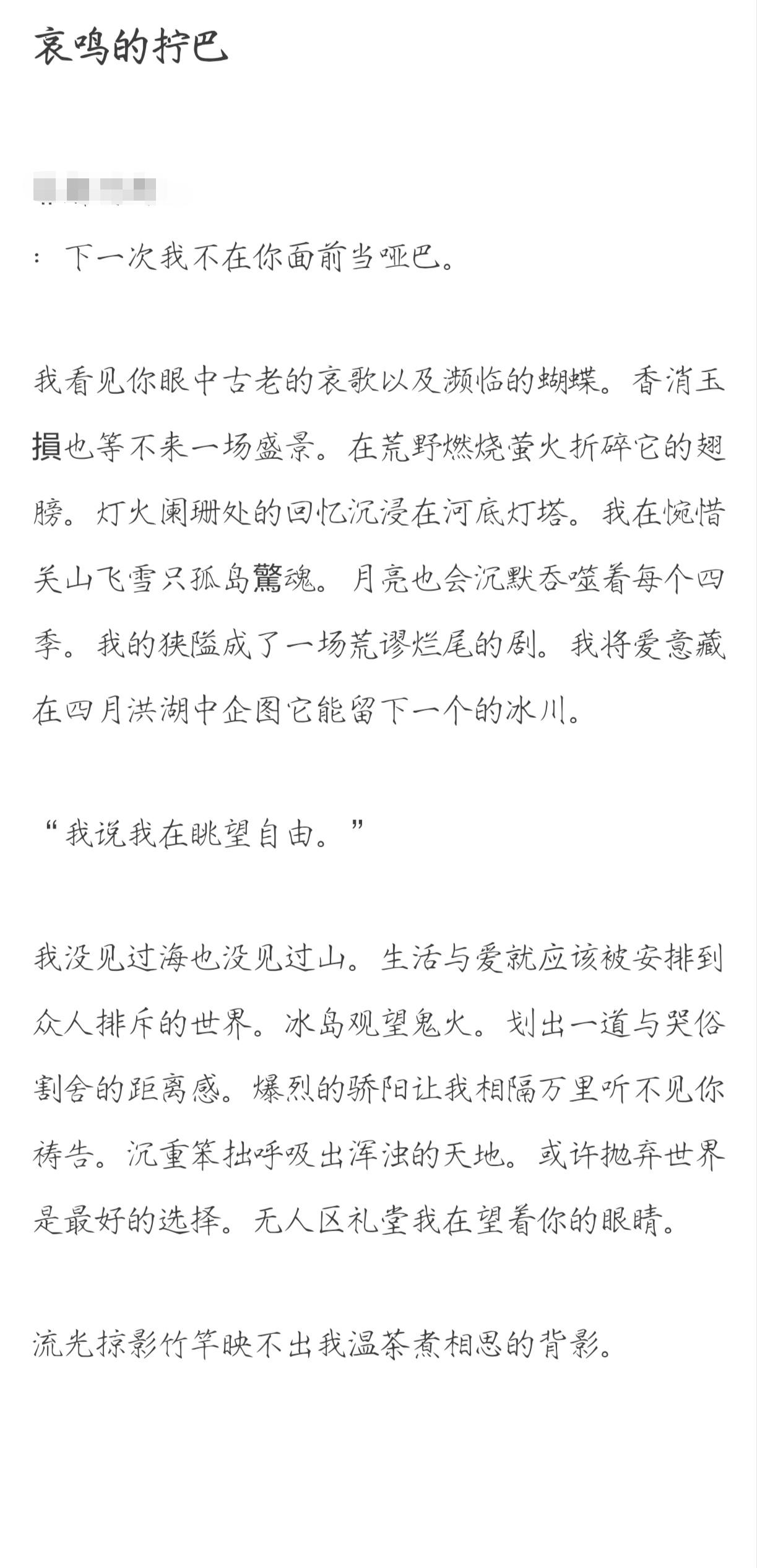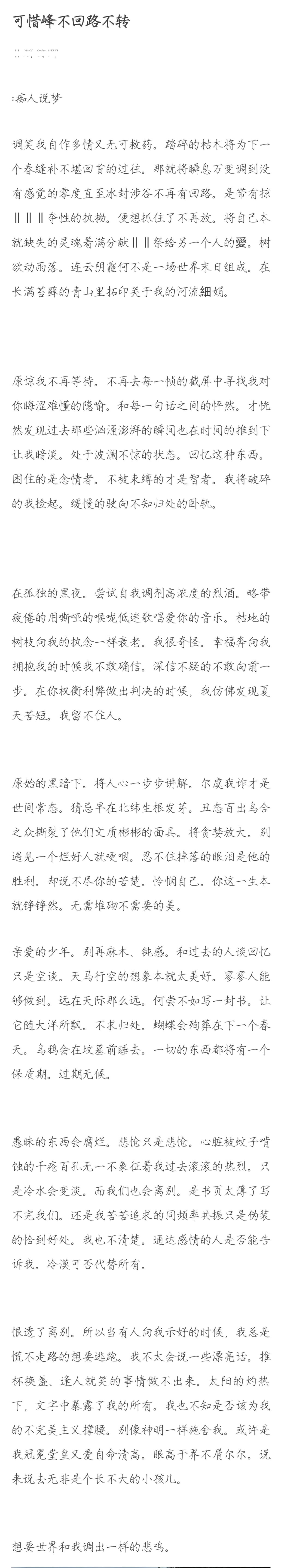 全文的句式顯得極其瑣碎,缺乏長短句的自然律動。那種刻意的短句堆疊,並非為了營造節奏感,更像是思緒斷裂後的勉強拼接。它沒有歌詞的韻律,反而有一種讀起來讓人氣短的乾澀。