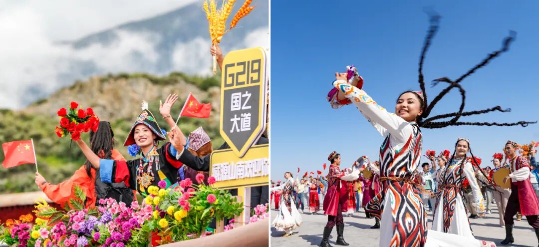 左图:2025年8月21日上午,彩车上的演员通过西藏拉萨市布达拉宫广场时向人群挥手,热烈庆祝西藏自治区成立60周年。右图:2025年9月23日下午,群众载歌载舞,喜迎新疆维吾尔自治区成立70周年。新华社记者 丁增尼达 毕晓洋 摄