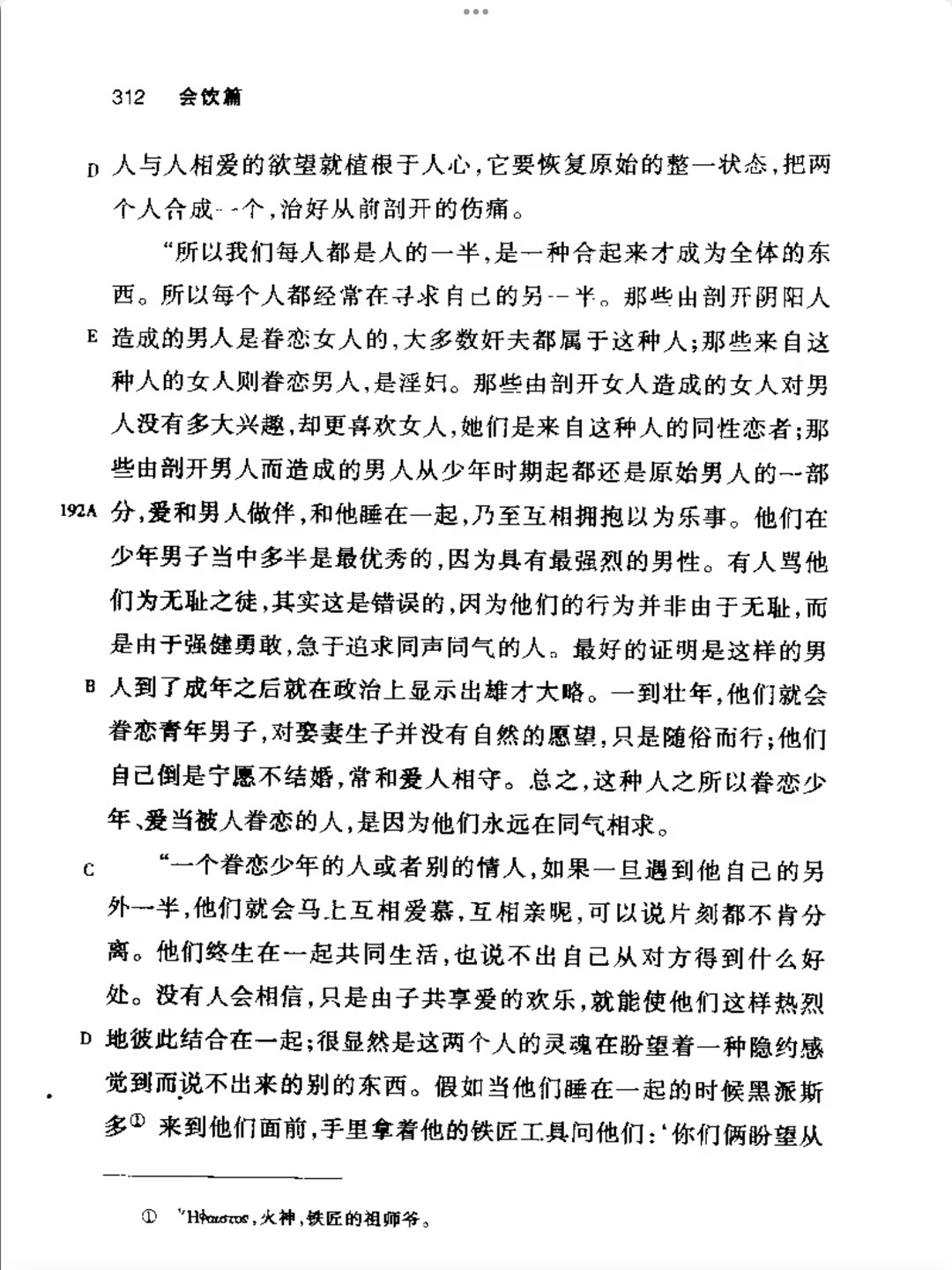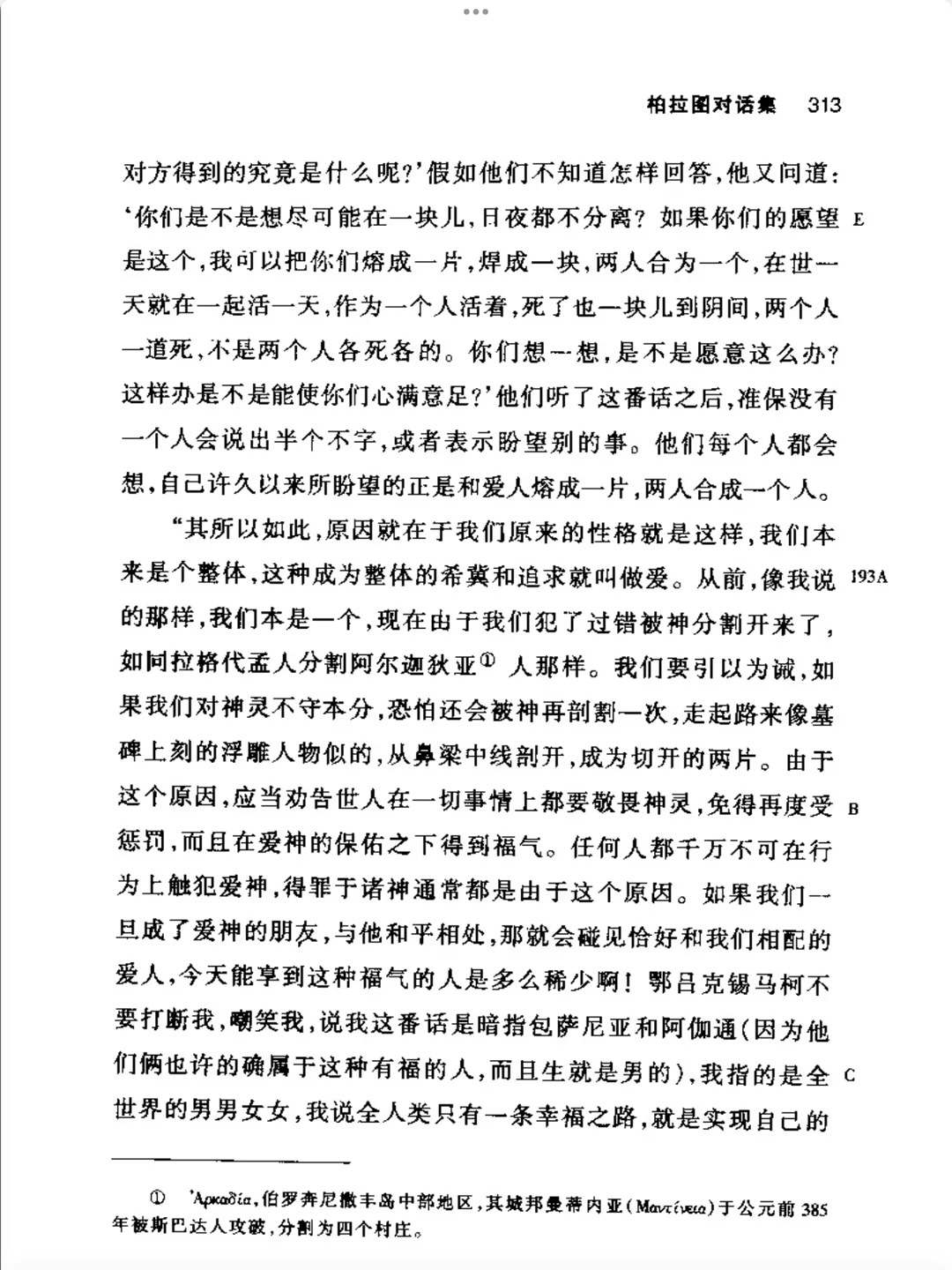 喜剧作家阿里斯多芬的发言,确实另类,用寓言讲述人以爱情寻求本身的完整。然而生命中找到近似于故事中原先的另一半身体便是可喜的,于是读出悲剧色彩