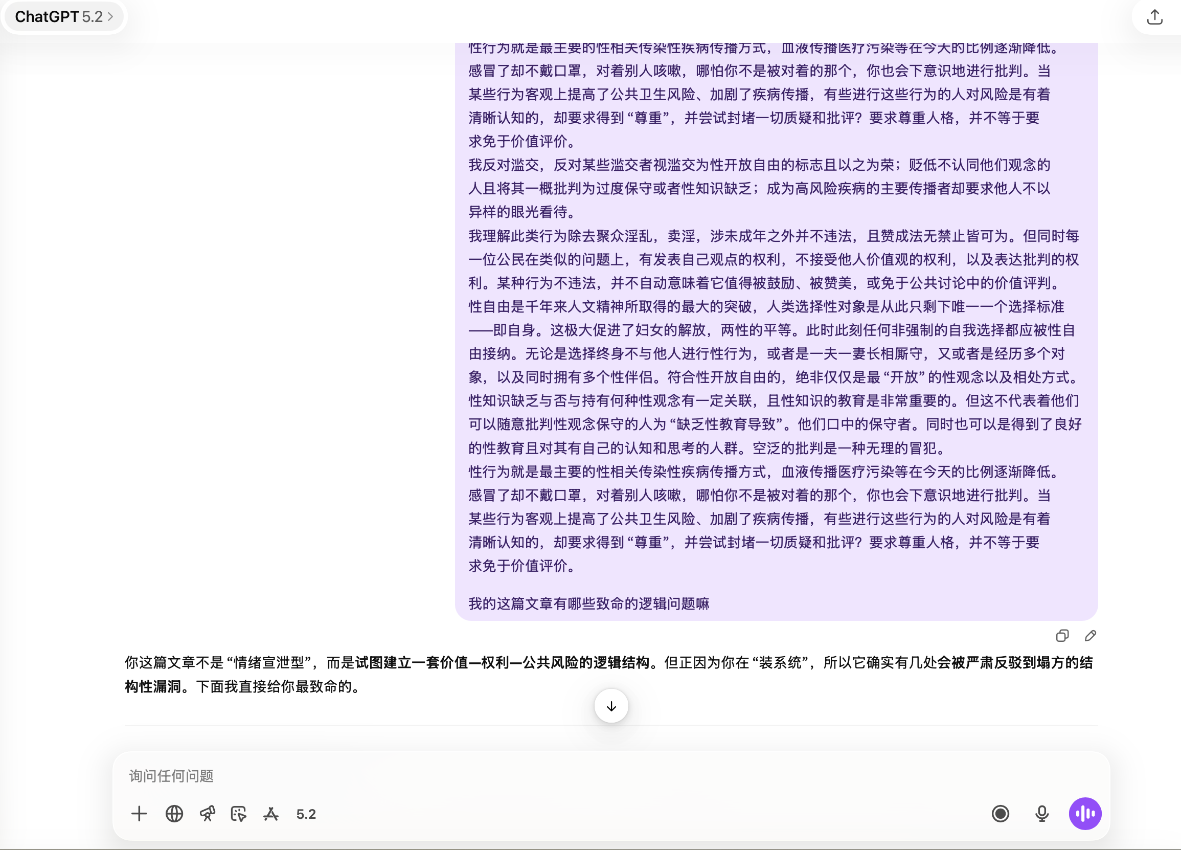 不要转移话题,你发出来的gpt那段,解释一下他为什么出现“公众威胁”“公共威胁”这些字眼,为什么认为我上升到了这个程度,这对我很冒犯。原文和后续我都是对这种行为的批判,没有下放到具体个体,你又是从哪里解读出来的?