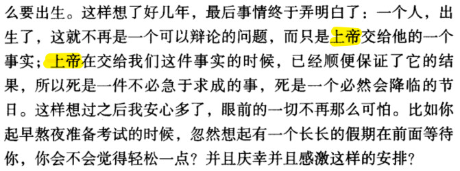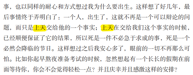 “史铁生在地坛中想明白了一个道理,那就是:‘一个人,出生了,这就不再是一个可以辩论的问题,而只是上帝交给他的一个事实;上帝在交给我们这个事实的时候,已经顺便保证了它的结果,所以死是一件不必急于求成的事,死是一个必然会降临的节日。’”