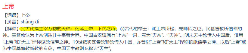 我不清楚这个词语为什么也要改动,其实,“上帝”并不是一个舶来词,它在我国古代文献中早就存在——《尚书》《诗经》里,“皇天上帝”“昊天上帝”频频出现,指的是主宰万物的天神,这是人类在童年和少年时期对宇宙和世界的解释,并不是如今所说的迷信,也与宗教信仰无关。