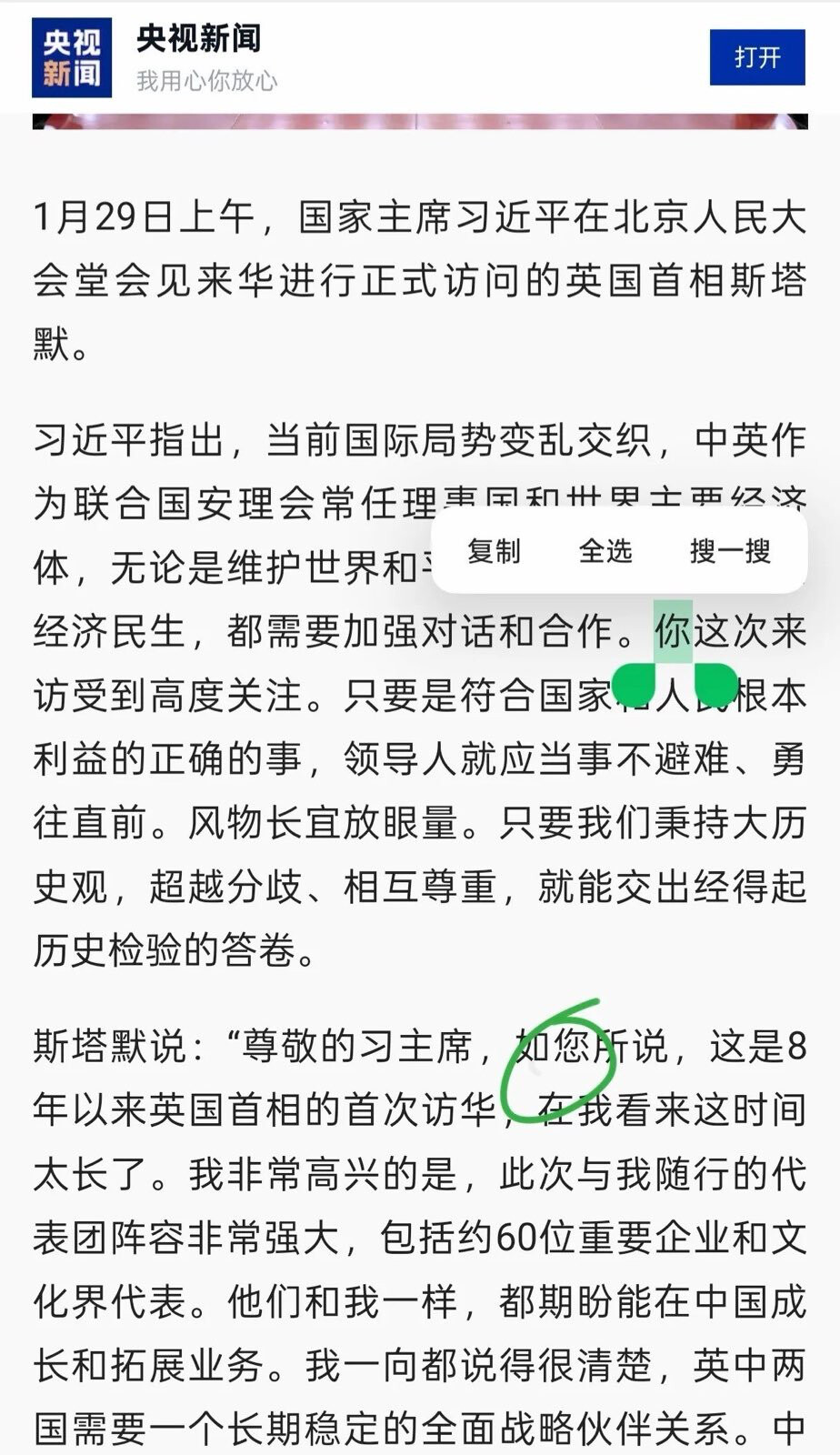 版主 suen 发布的最新截图中,用绿色圆圈重点标注了斯塔默(Starmer)对习近平说的话。在标准或通用的外交辞令译文中,为了表示尊重,通常应使用尊称“您”。但在 suen 转发并修改过的文本中,斯塔默的第一句话是:“尊敬的习主席,如你所说……”。