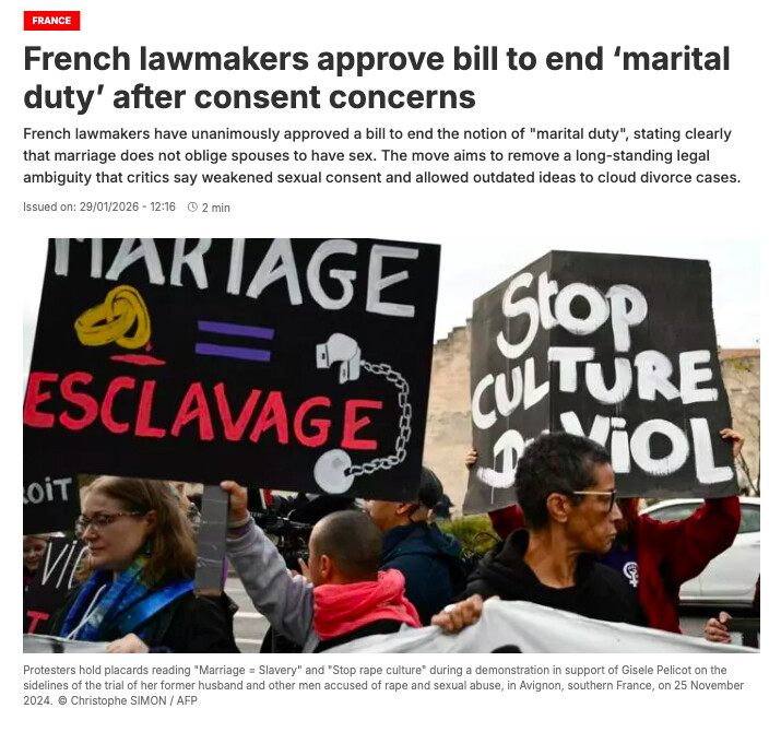 最近有一条引发广泛关注的新闻。法国通过了一项法案,将在民法典中新增条款,明确规定:人们在婚姻和共同生活中并不承担性义务。