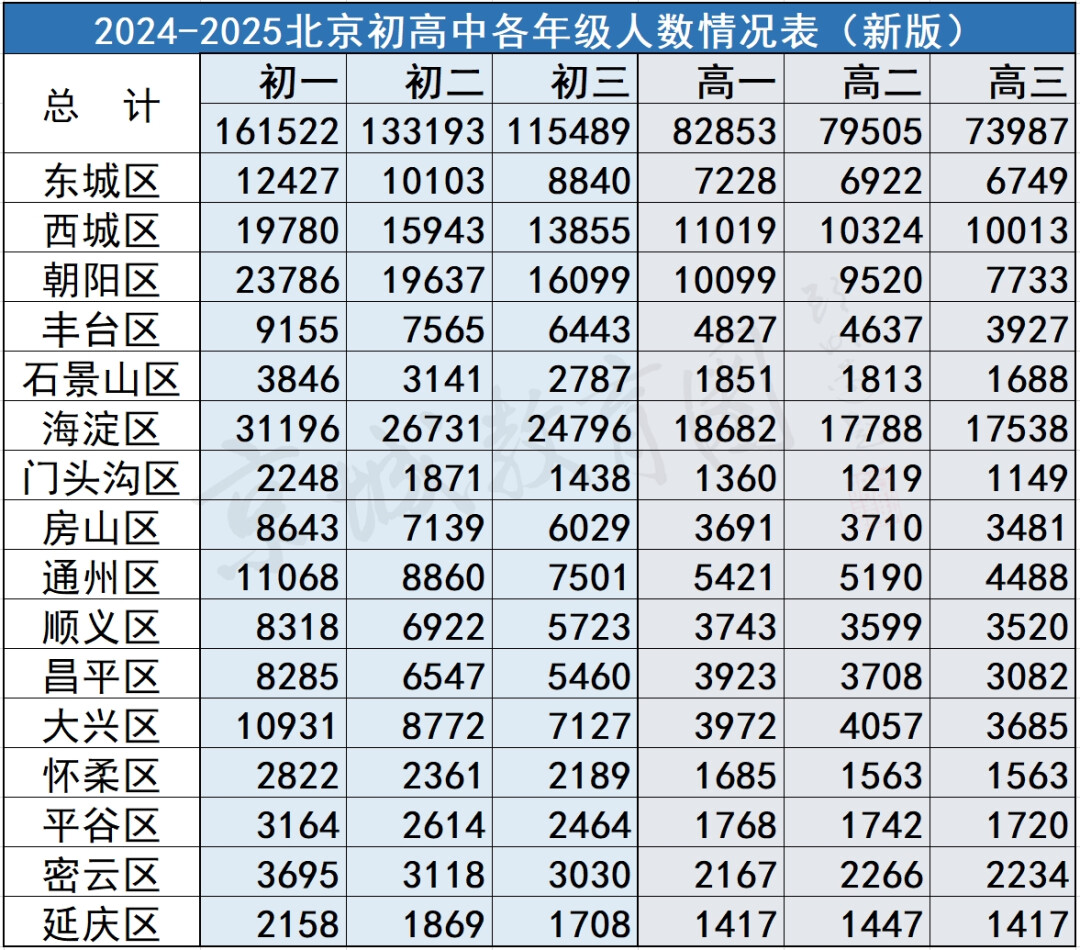 初一人数为161522人,和前一年同期相比增加26368人。其中海淀区涨幅最为明显,增加了4063人。