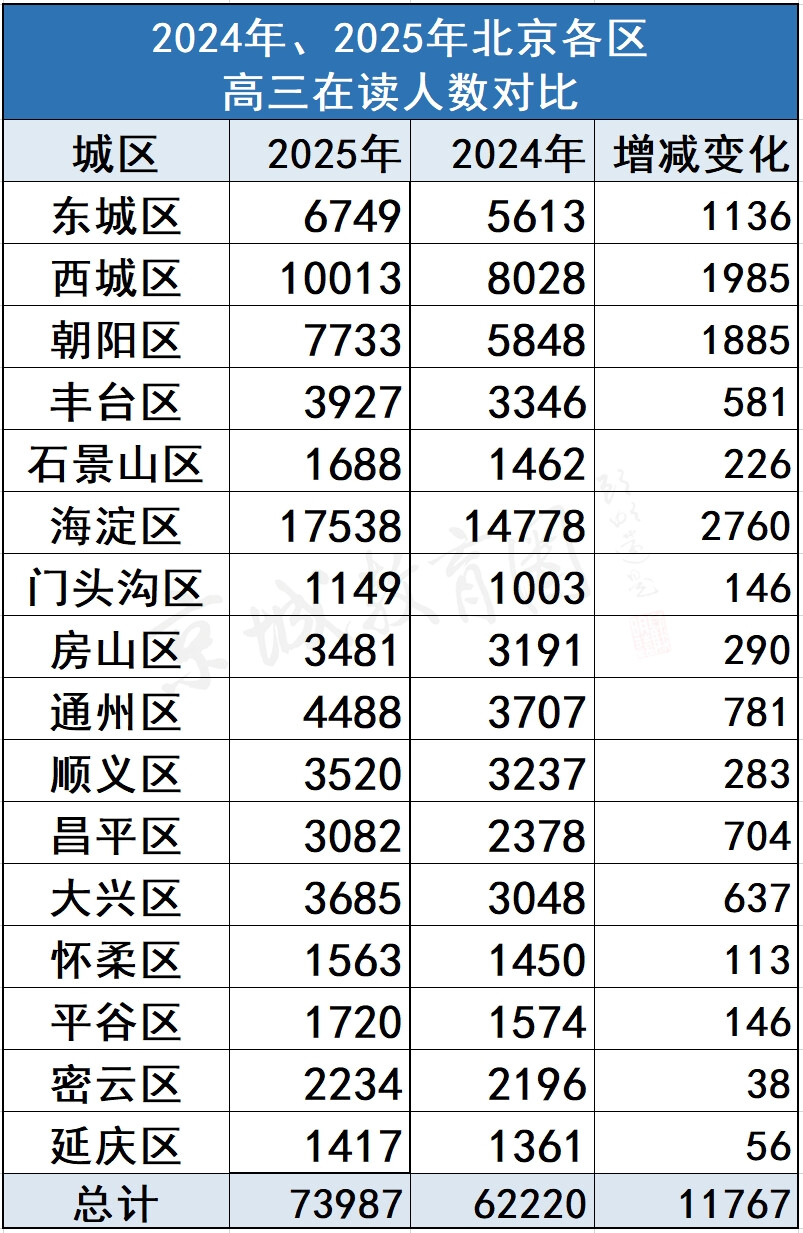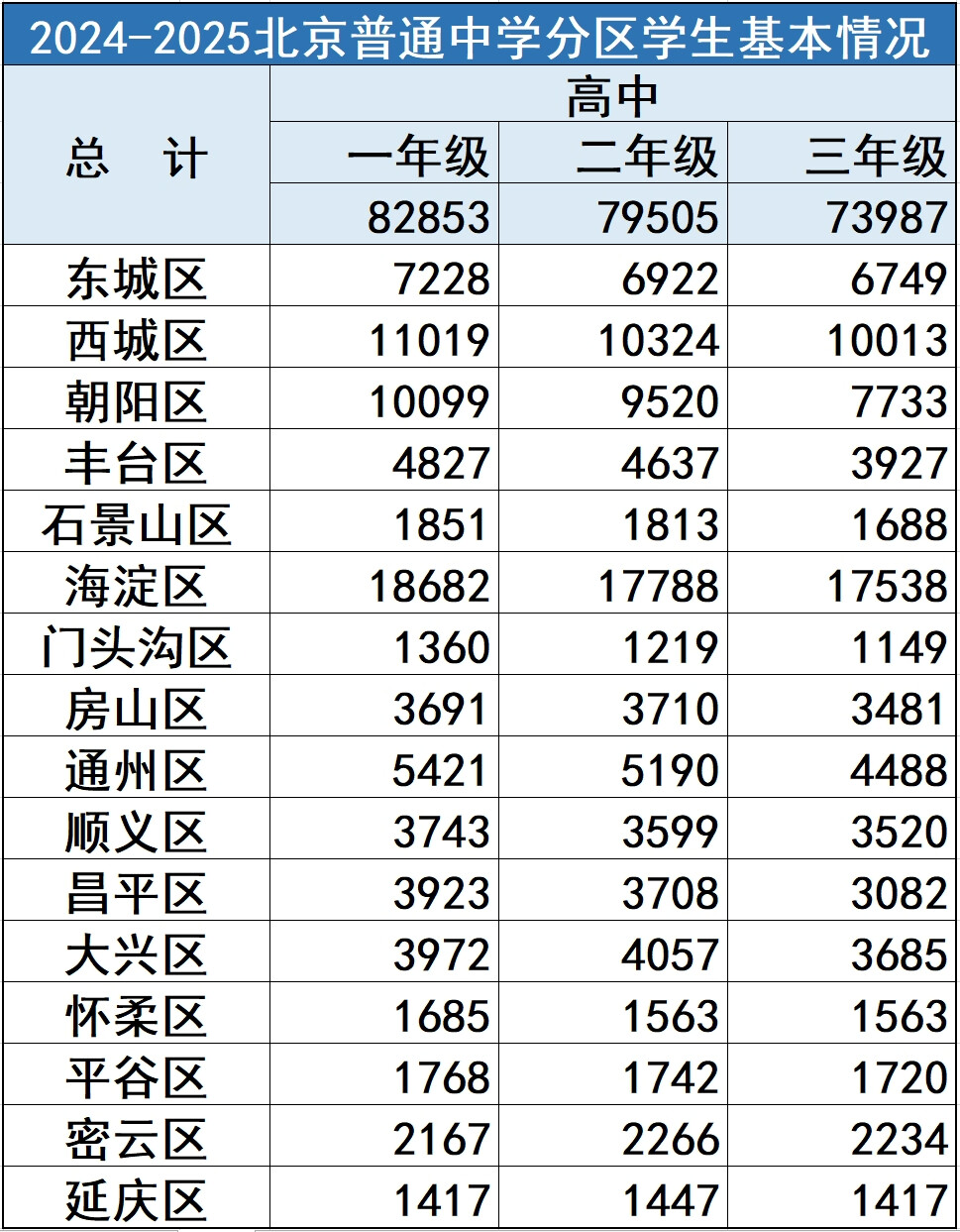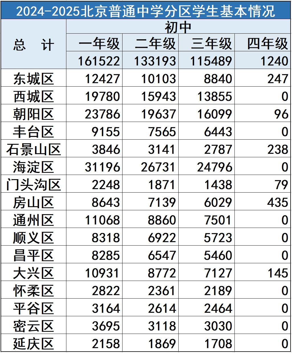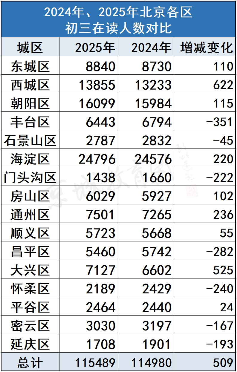 2024-2025年度初三在校生人数为115489人,和前一年同期相比增加509人。其中西城区涨幅最为明显,增加了622人,紧随其后的增加较多的地区有大兴、通州、海淀、朝阳等。