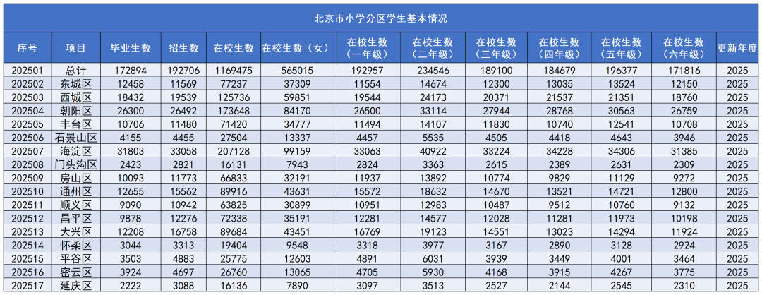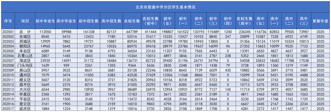 近日,北京公共数据开放平台更新了市教委提供的**《小学分区学生基本情况》和《普通中学分区学生基本情况》**,数据截止2025年度。