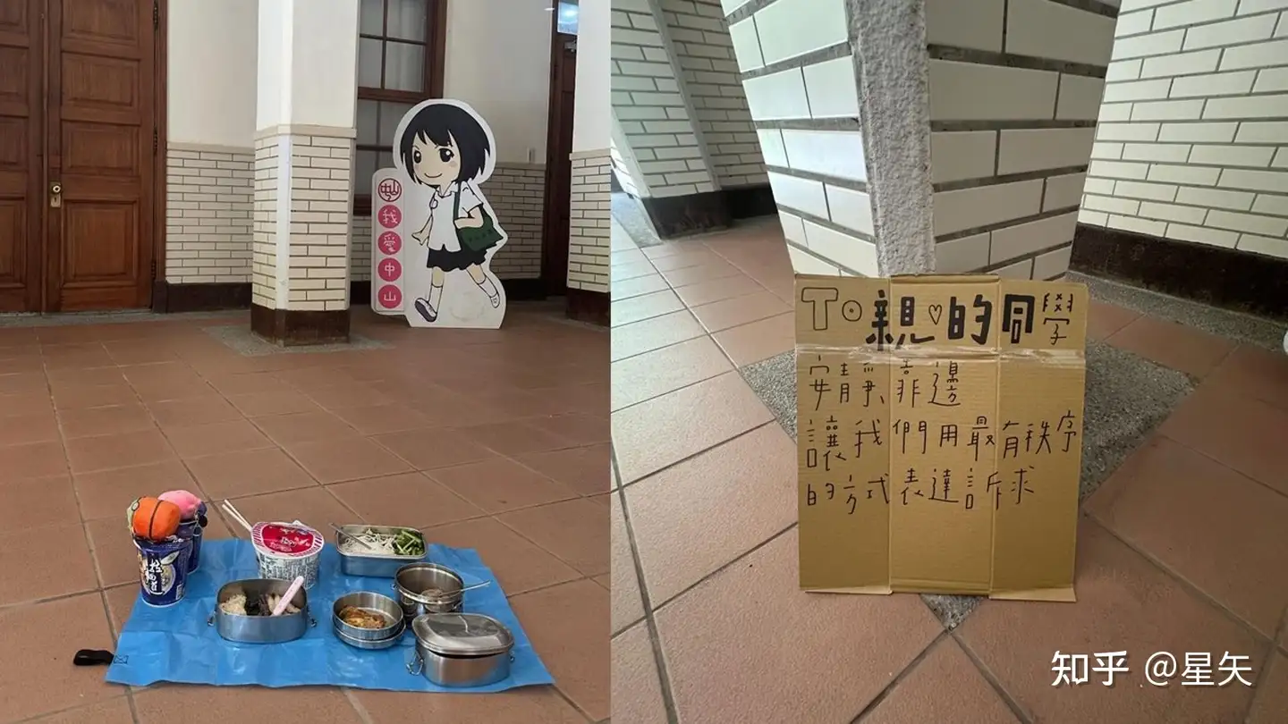 台北中山女子高中的学生为了争取自由午餐订外食的权利,组织同学中午到校长室外面吃午餐表达要求。