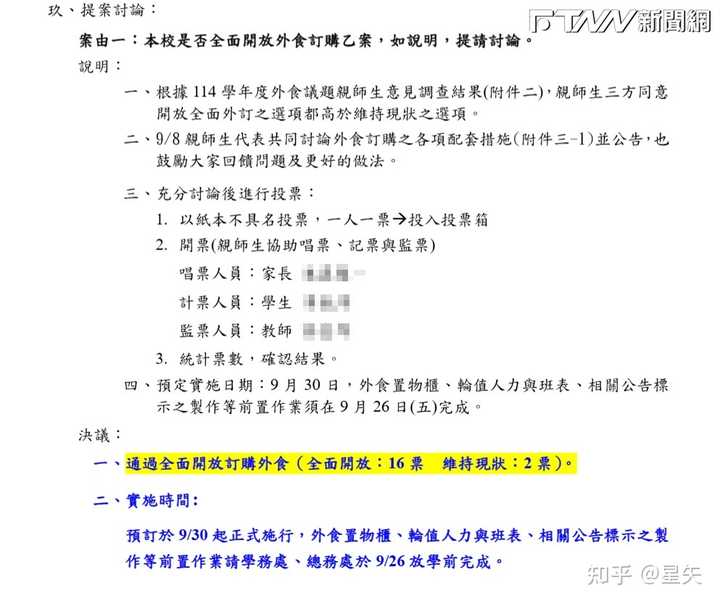 抗议十几天后校长招开「膳食管理委员会」,找来教师、家长和学生代表开会和投票,以16:2的票数通过学生可以自由订外卖。