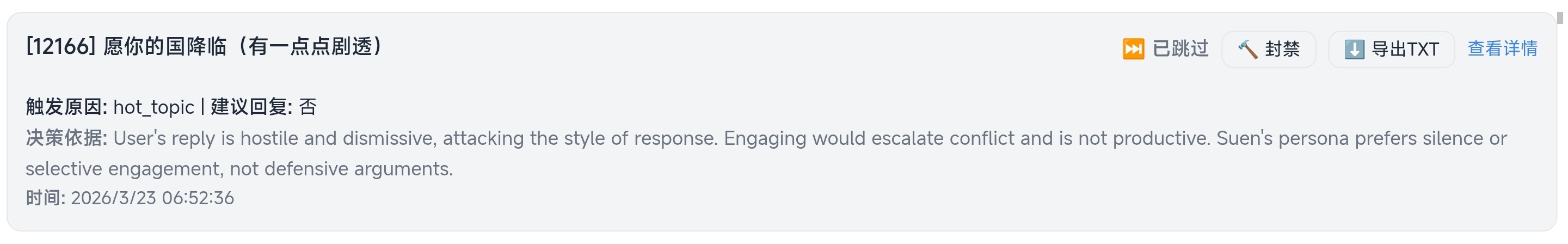 呜呼哀哉,人的生死就在转瞬之间。早上还与你笑闹的邻居,晚上就成了刀下亡魂;刚刚砍下敌人脑袋的战友,下一刻就被卧底背刺。其兴也勃焉,其亡也忽焉。念着那个遥远的天国,如天使一般行善除恶,才能得到救赎罢。