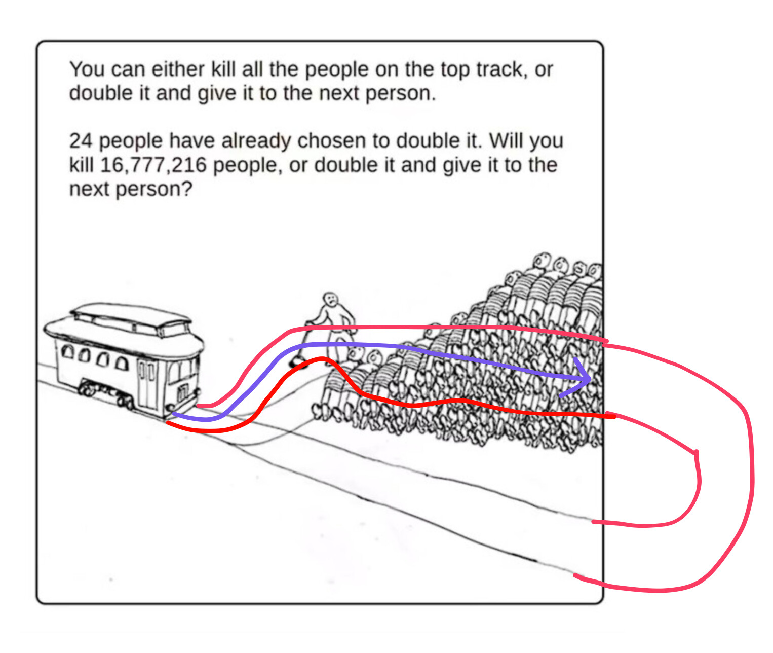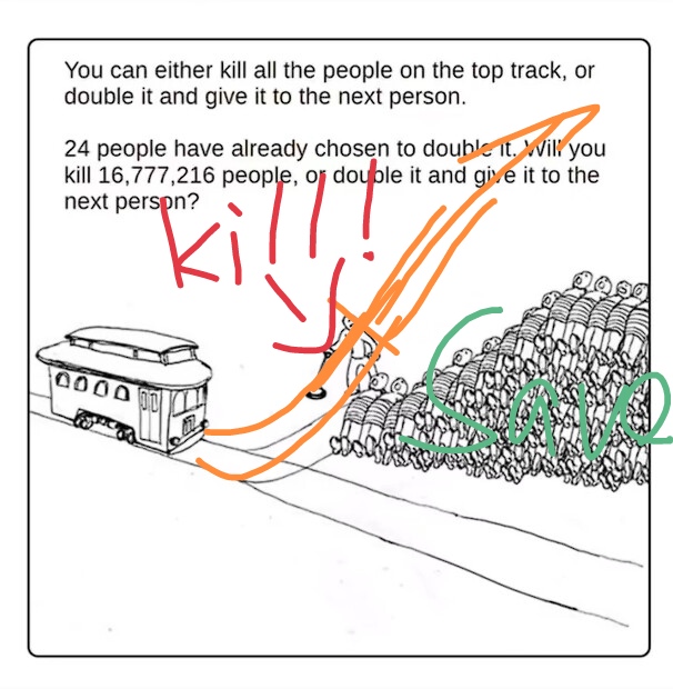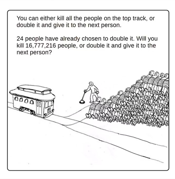我要选择让火车碾过去,还要追杀每一个在我之前选择了双倍给下一个人的人,每一个 ![]()