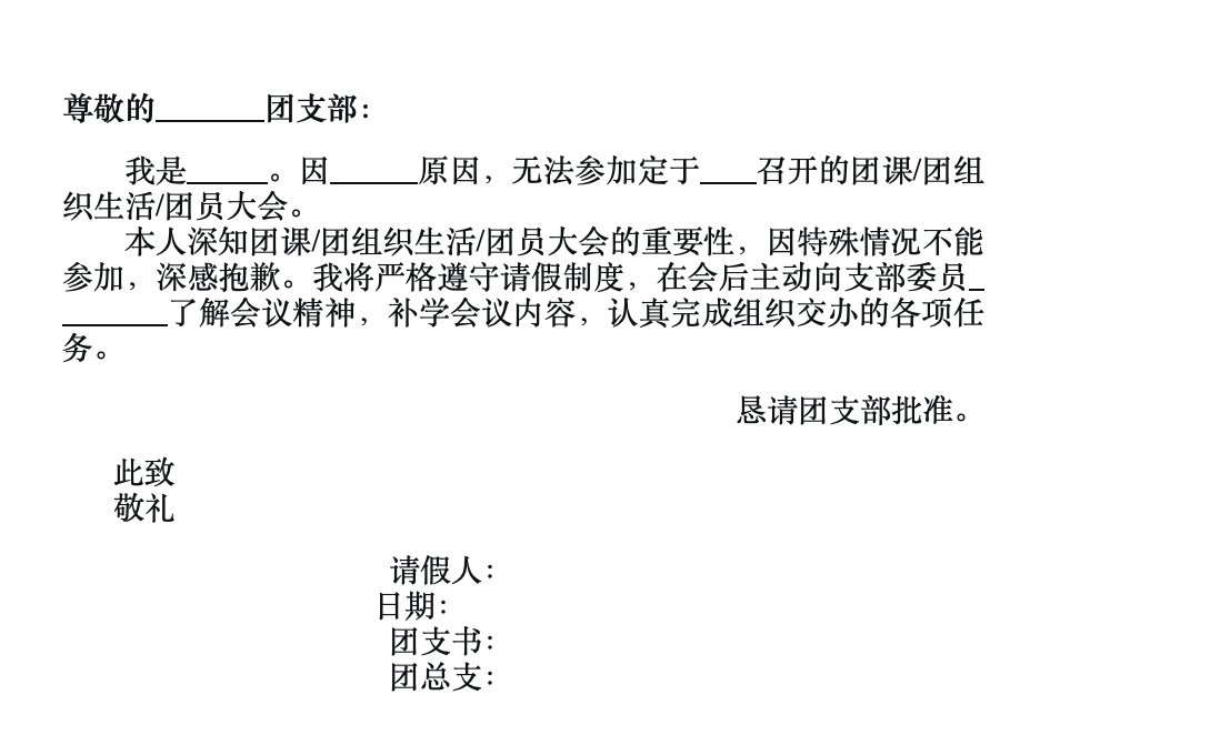 「请各位同学注意,团课、团组织生活、团员大会非特殊原因未参与,均以旷课计算,每月月末将进行公示。请大家认真履行好团员义务,因特殊原因,请提前请假,请假流程:团支书签字→团总支签字(团总支书记因公出差等,由团副代签)。请用以下附件模版请假,同时将请假条电子版扫描件发给组织部部长【隐去】留存。@全体成员」
