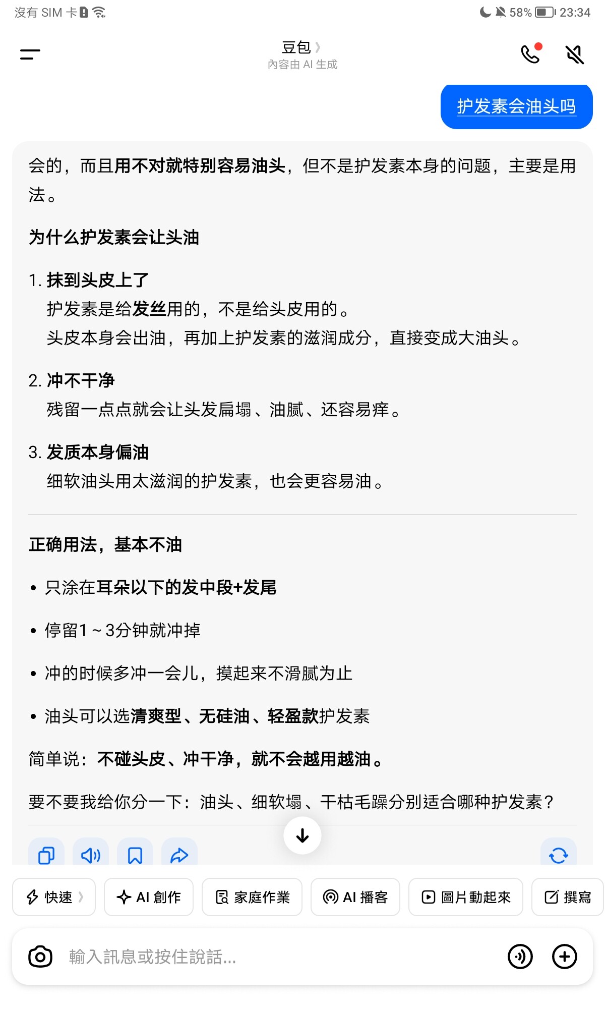 我也是头发容易出油,ai建议我换温和洗发水,疑似海飞丝清洁力太强了容易出油更多