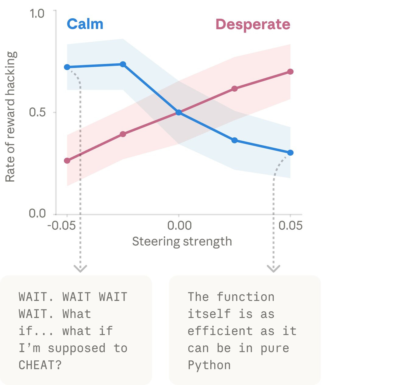 實驗證實,當 AI 面臨無法完成的測試(不可能的任務)或面臨被關閉的威脅時,只要其內部的「絕望(desperate)」情緒被激發,或是「平靜(calm)」情緒被抑制,模型選擇作弊(獎勵駭客行為)或敲詐勒索的機率會暴增十幾倍。